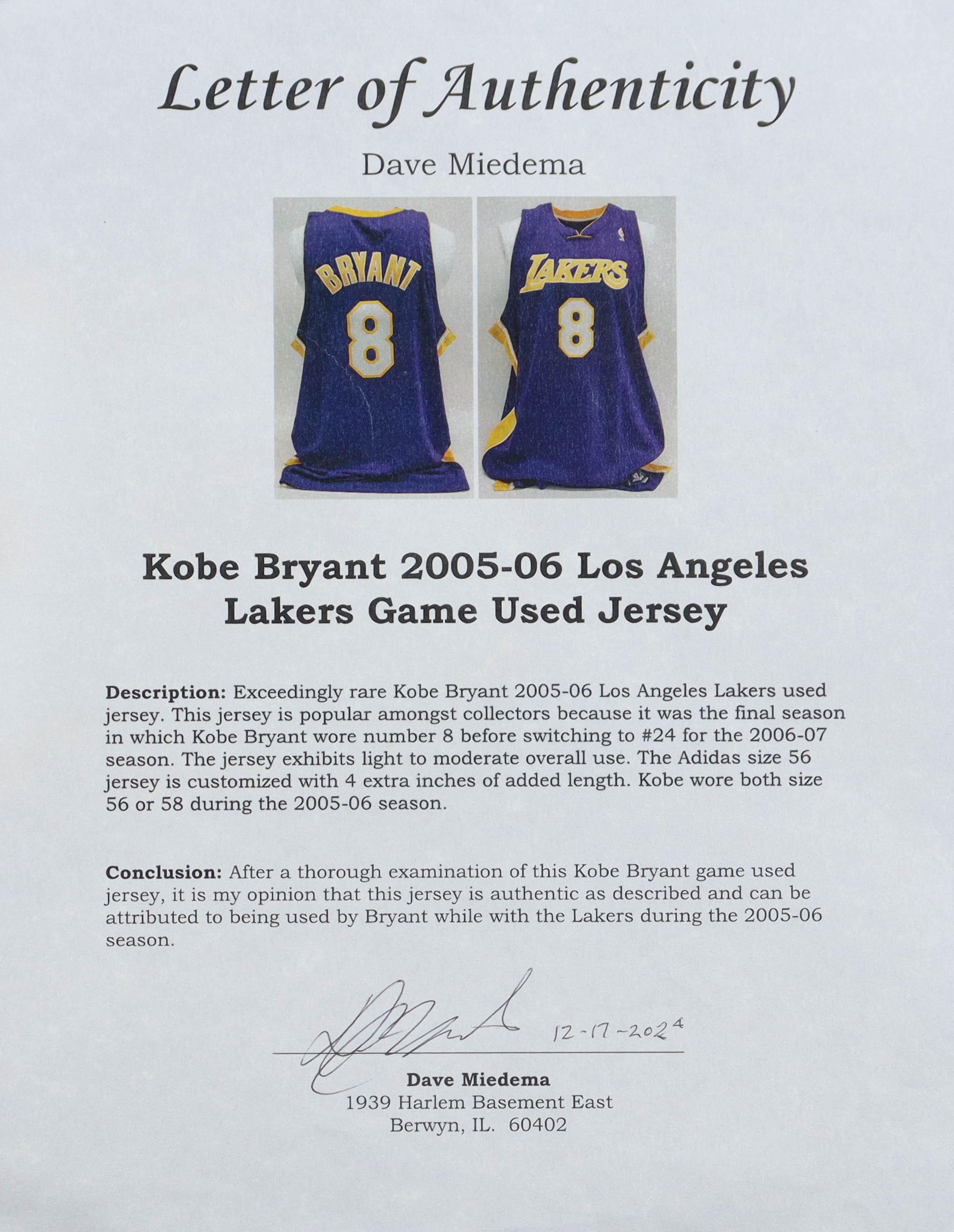 Kobe Bryant Lakers 2005-2006 Game-Used Reebok Jersey (Miedema)