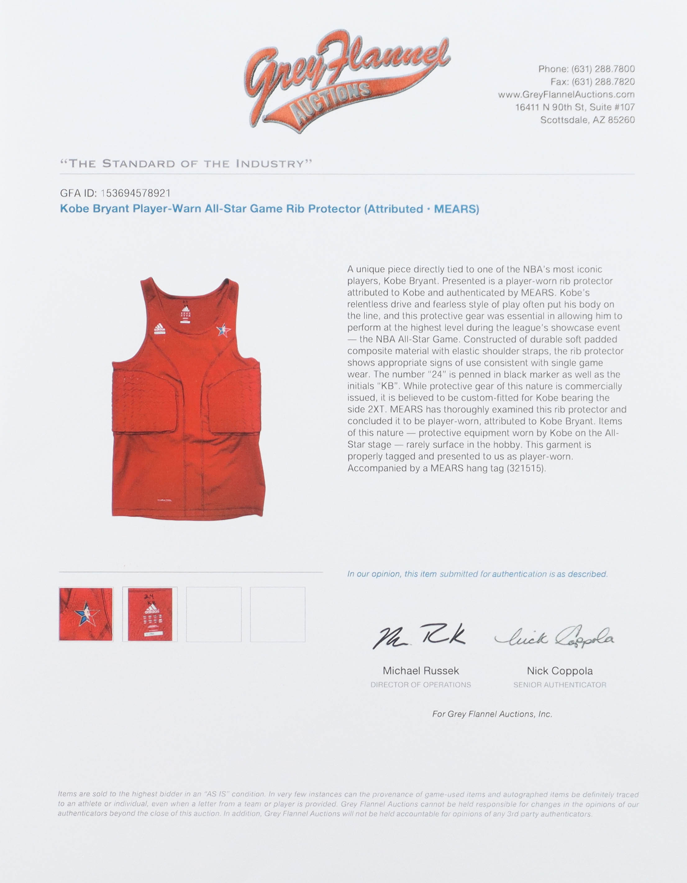 Presented is a player-worn rib protector attributed to Kobe Bryant and authenticated by MEARS.