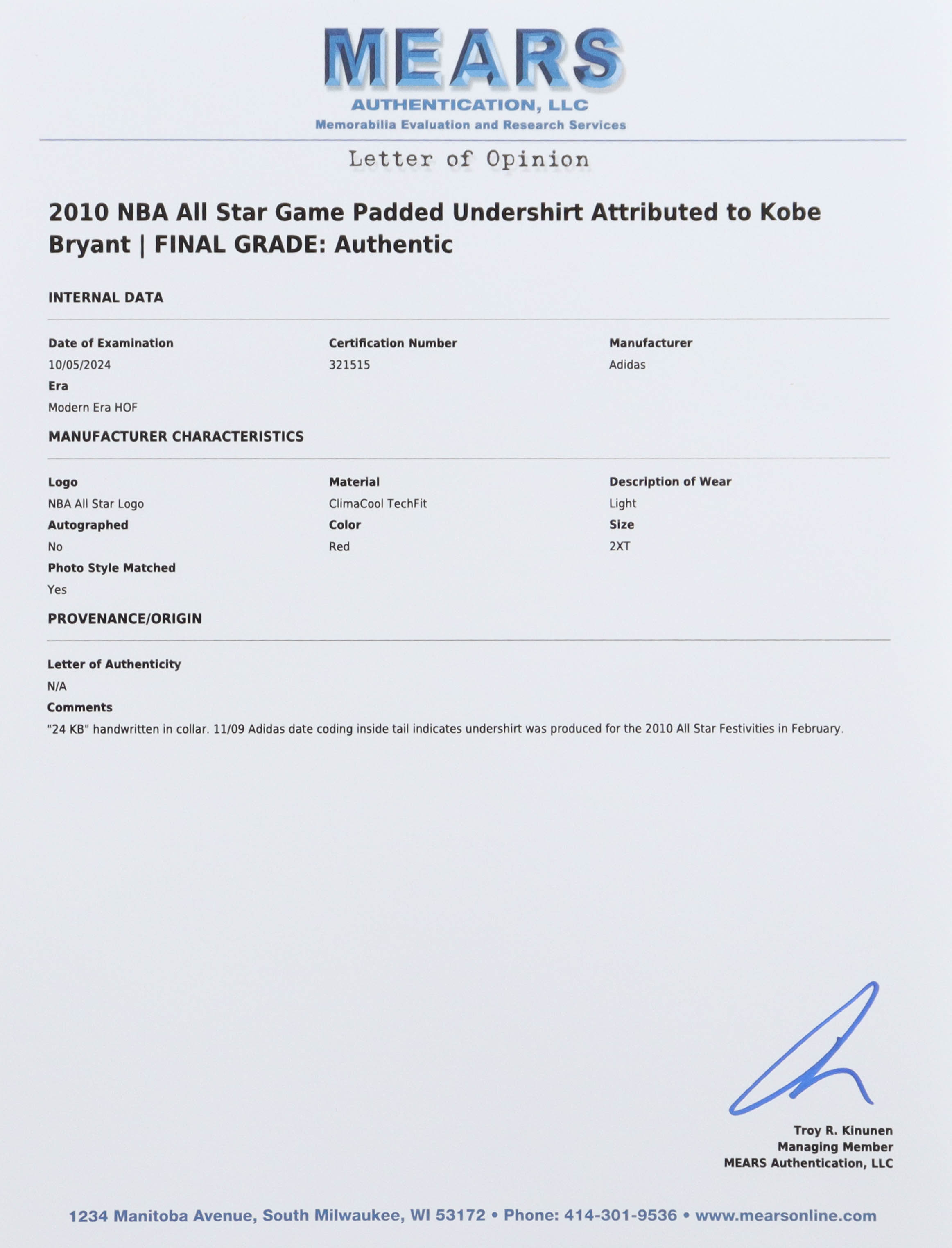 - The garment is properly tagged and presented as player-worn. Accompanied by a MEARS hang tag (321515).