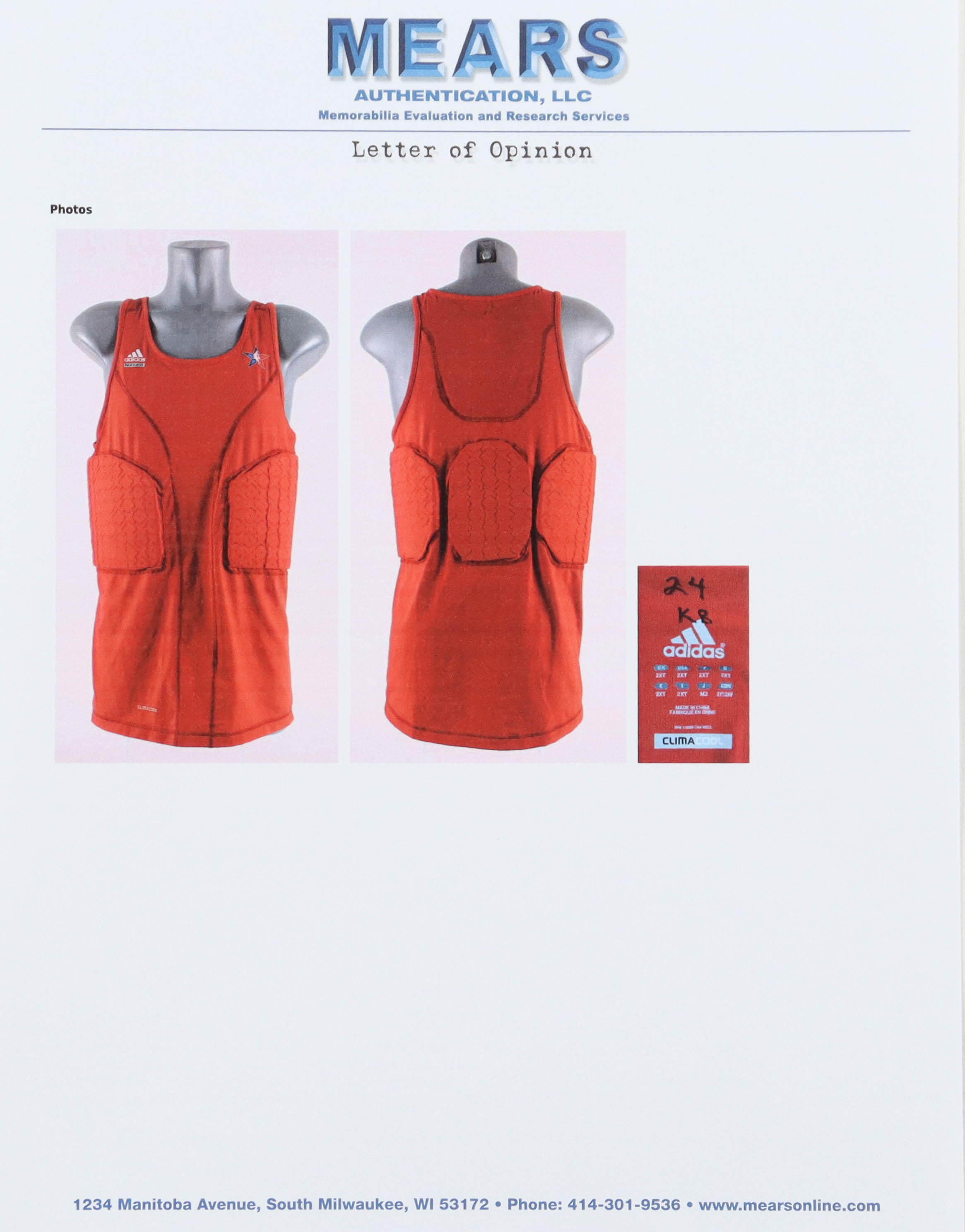 Adidas rib protector, size 2XT. The rib protector was worn during the 2010 All-Star game by basketball icon, Kobe Bryant (D. 2020, Los Angeles Lakers, HOF).