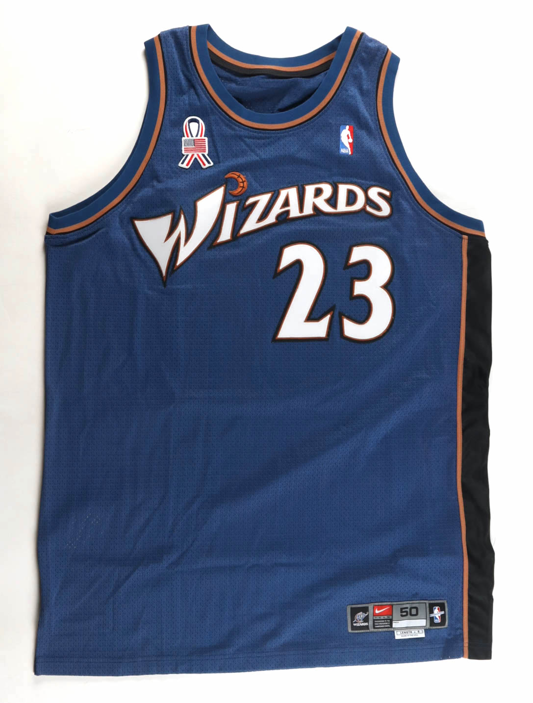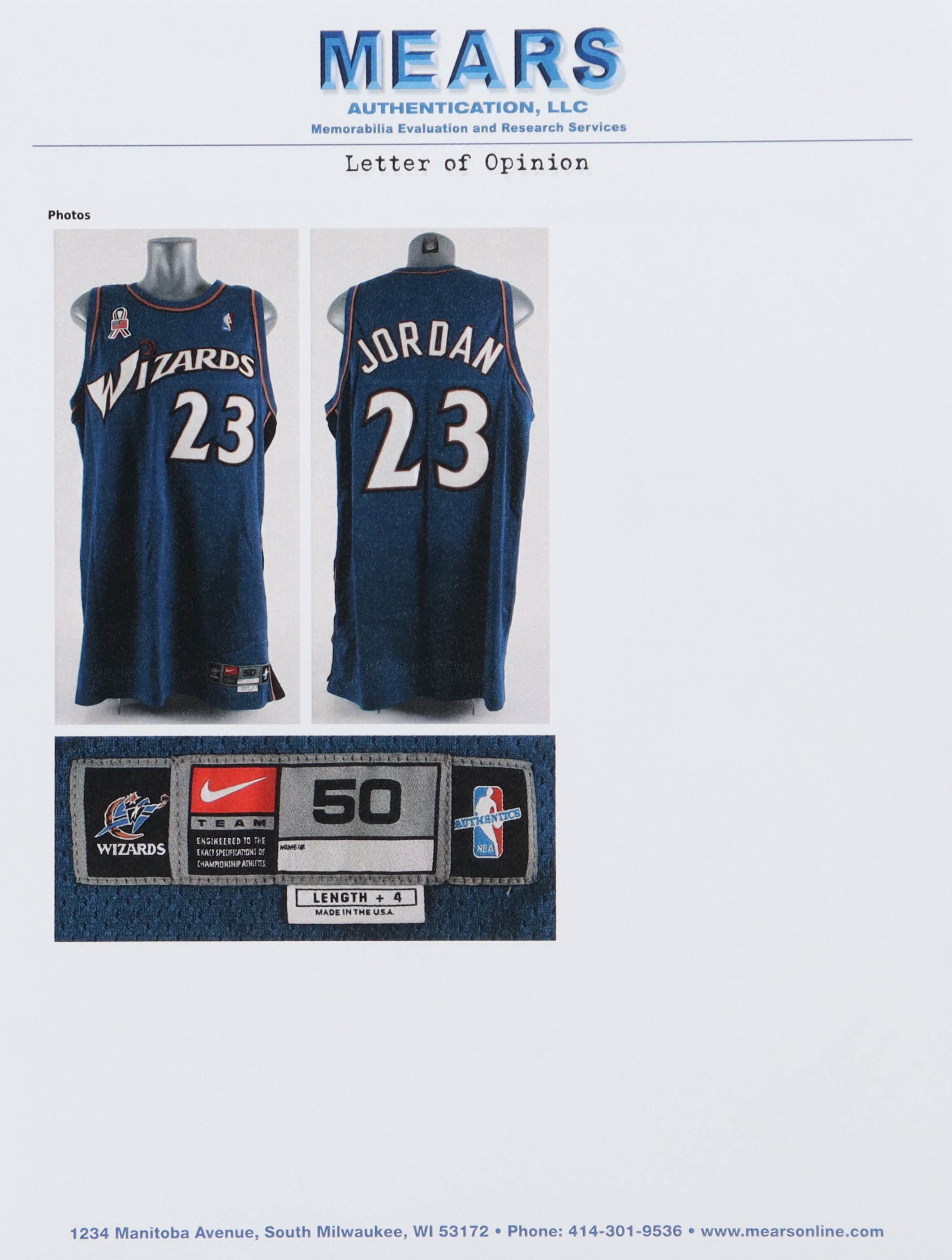 Nike jersey, size 50 (Length +4). The jersey was worn in game during the 2001-2002 season by basketball icon, Michael Jordan (Washington Wizards, HOF).