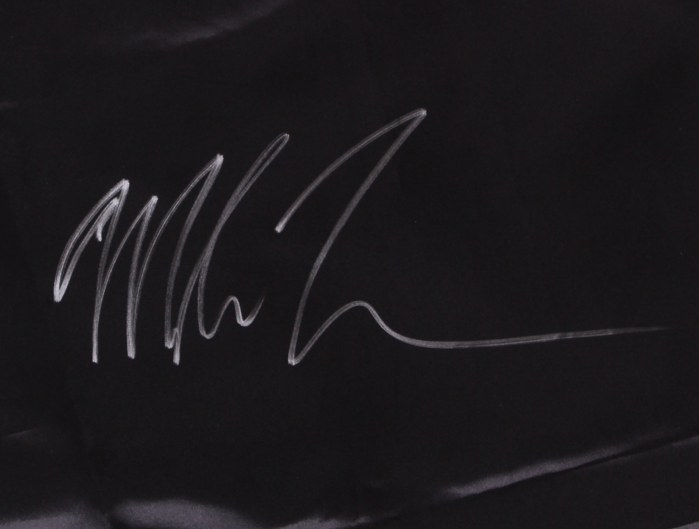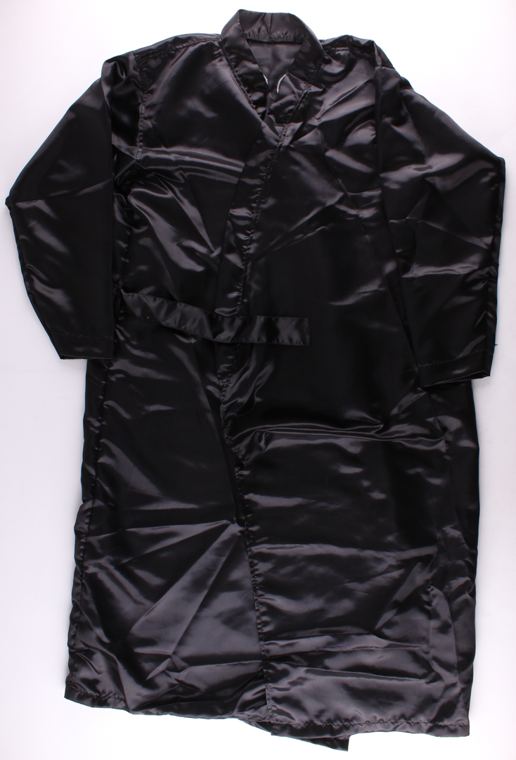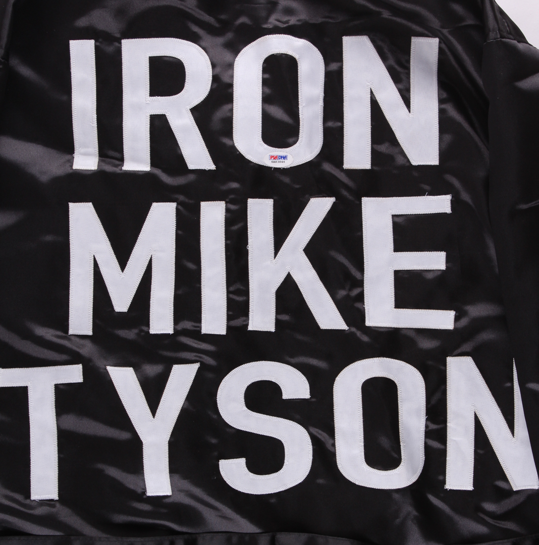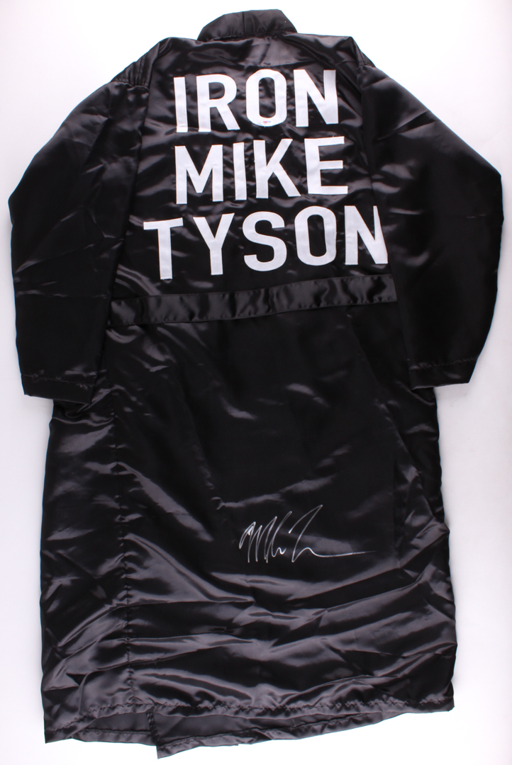 Custom full-size fight style boxing robe features "Iron Mike Tyson" stitched onto the back side of the robe. Hand-signed in silver paint-pen by Mike Tyson (HOF).