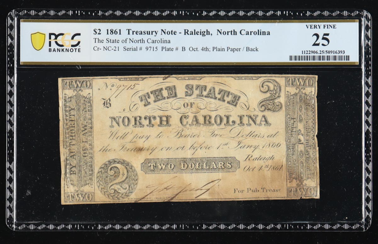 1861 North Carolina $2 Treasury Note - Raleigh, NC (PCGS Very Fine 25)