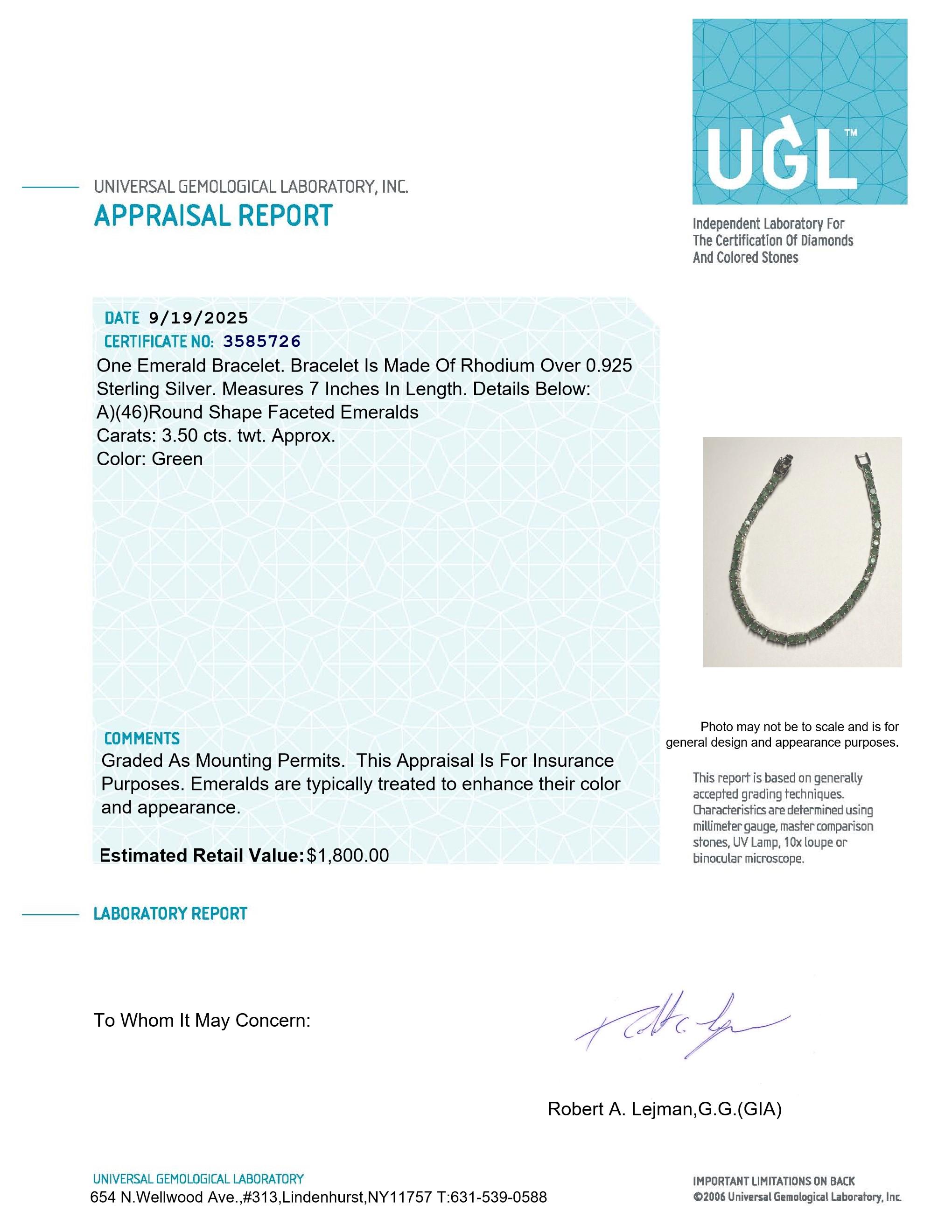 Ladies emerald bracelet set in rhodium over .925 sterling silver. Bracelet measures approximately 7 inches in length and features a continuous line of round faceted emeralds. Includes UGL appraisal for documentation and insurance purposes.