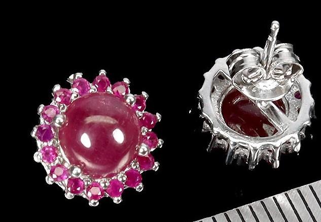 Elegant pair of ladies ruby earrings set in rhodium over sterling silver. Classic halo-style design featuring cabochon rubies surrounded by faceted ruby accents. Includes UGL appraisal for documentation and insurance purposes.