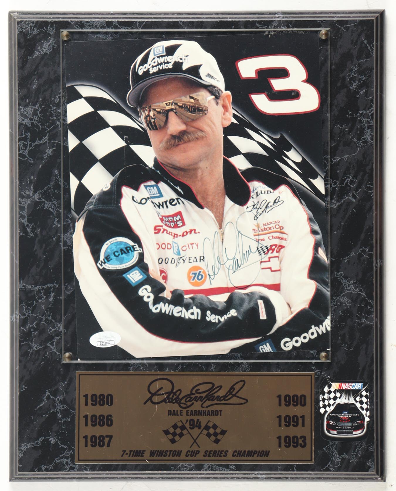 Custom plaque measures 15" x 12" in size. Photograph is hand-signed by Dale Earnhardt Sr. (d. 2001).