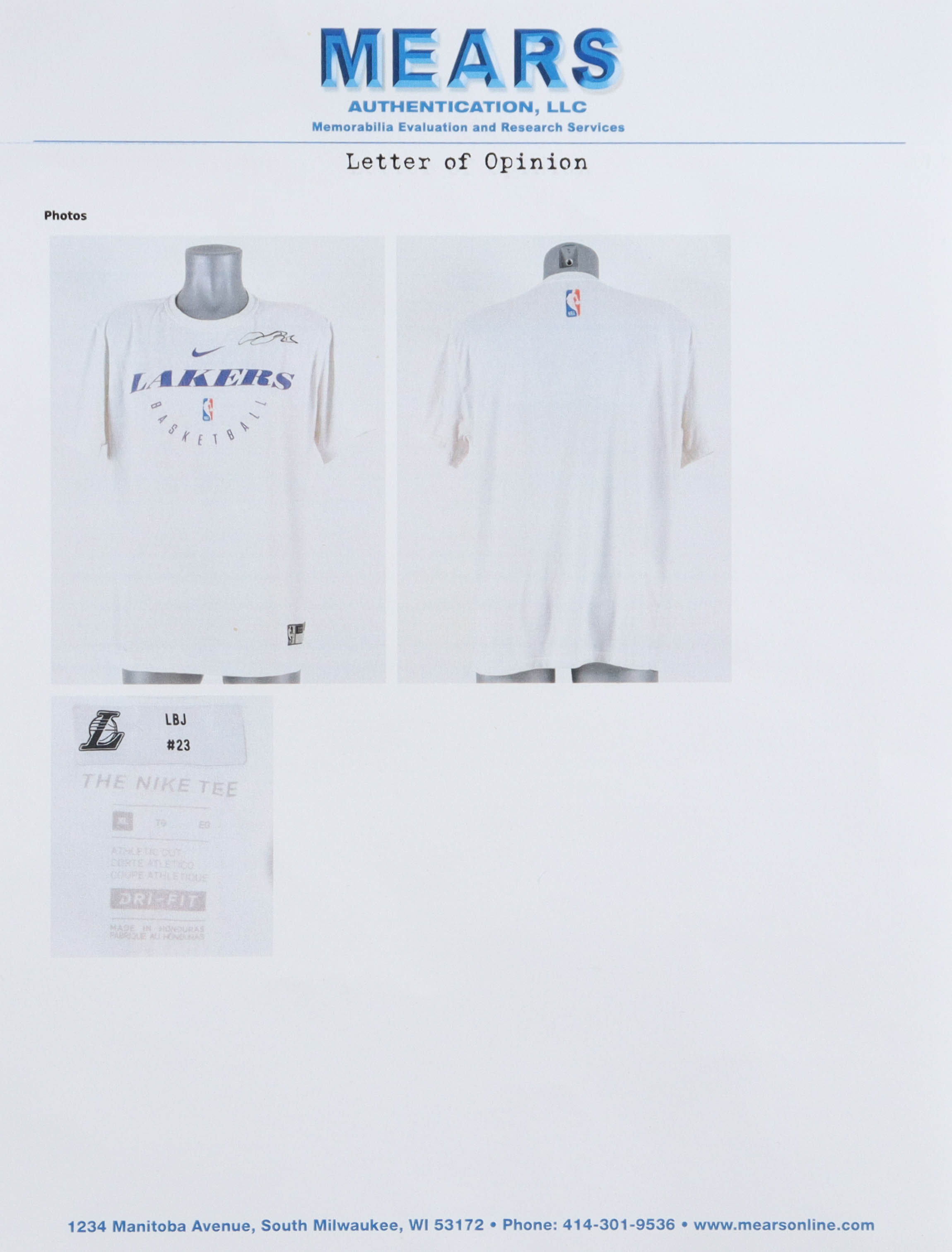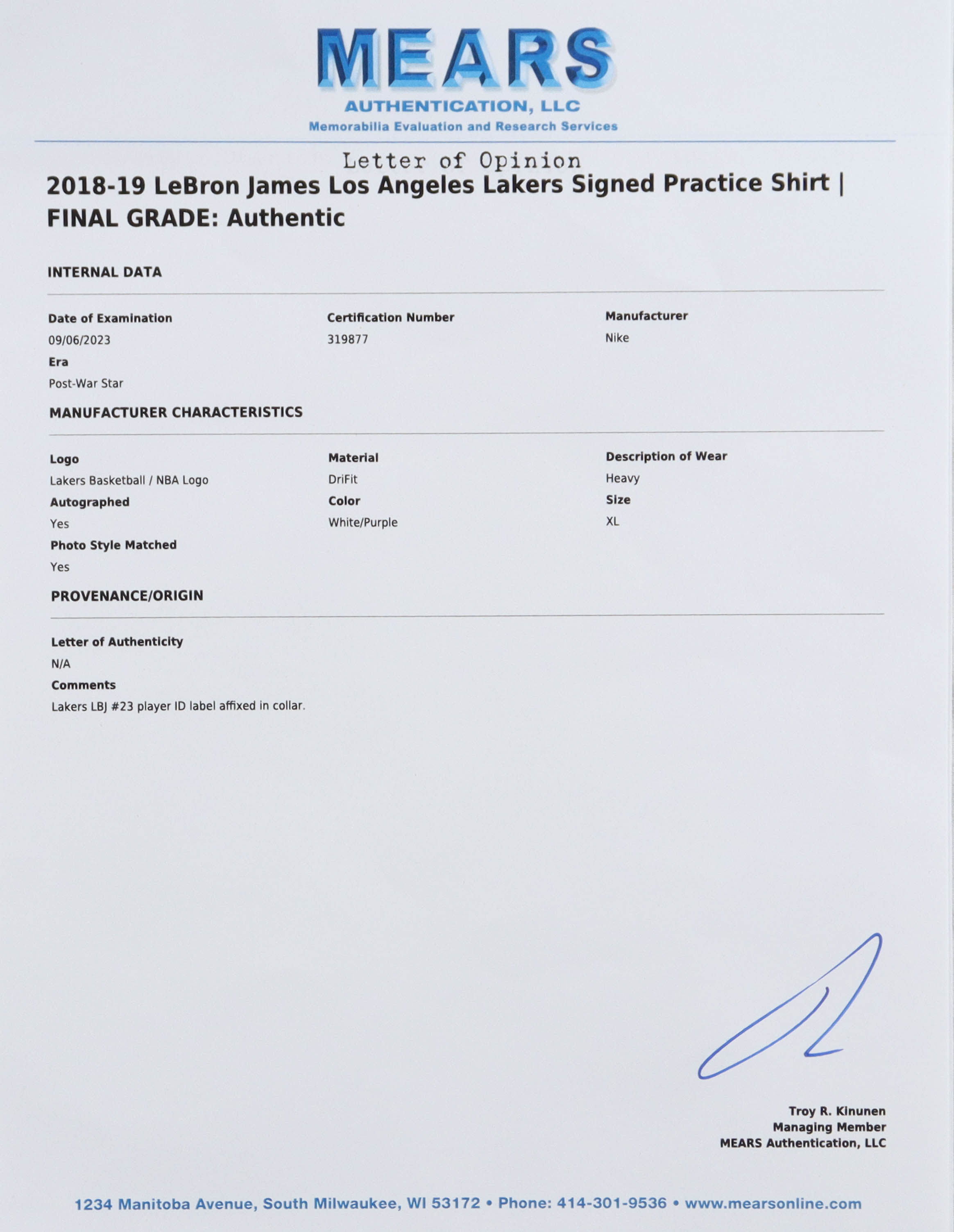 2018-19 Los Angeles Lakers Nike practice shirt, size XL. Hand-signed and practice used by LeBron James during the 2018-19 season. Please note, LBJ #23 player ID label is affixed in the collar.