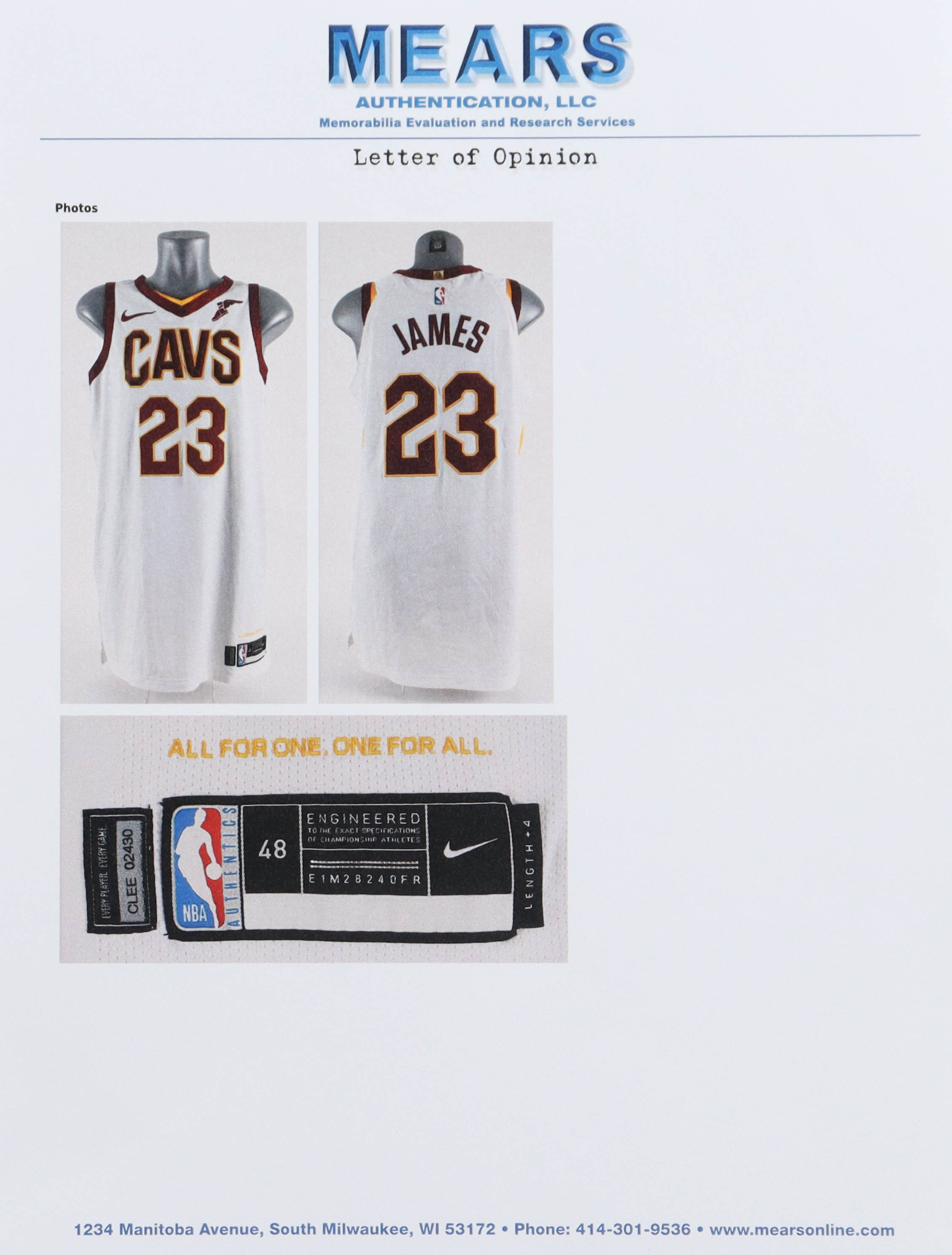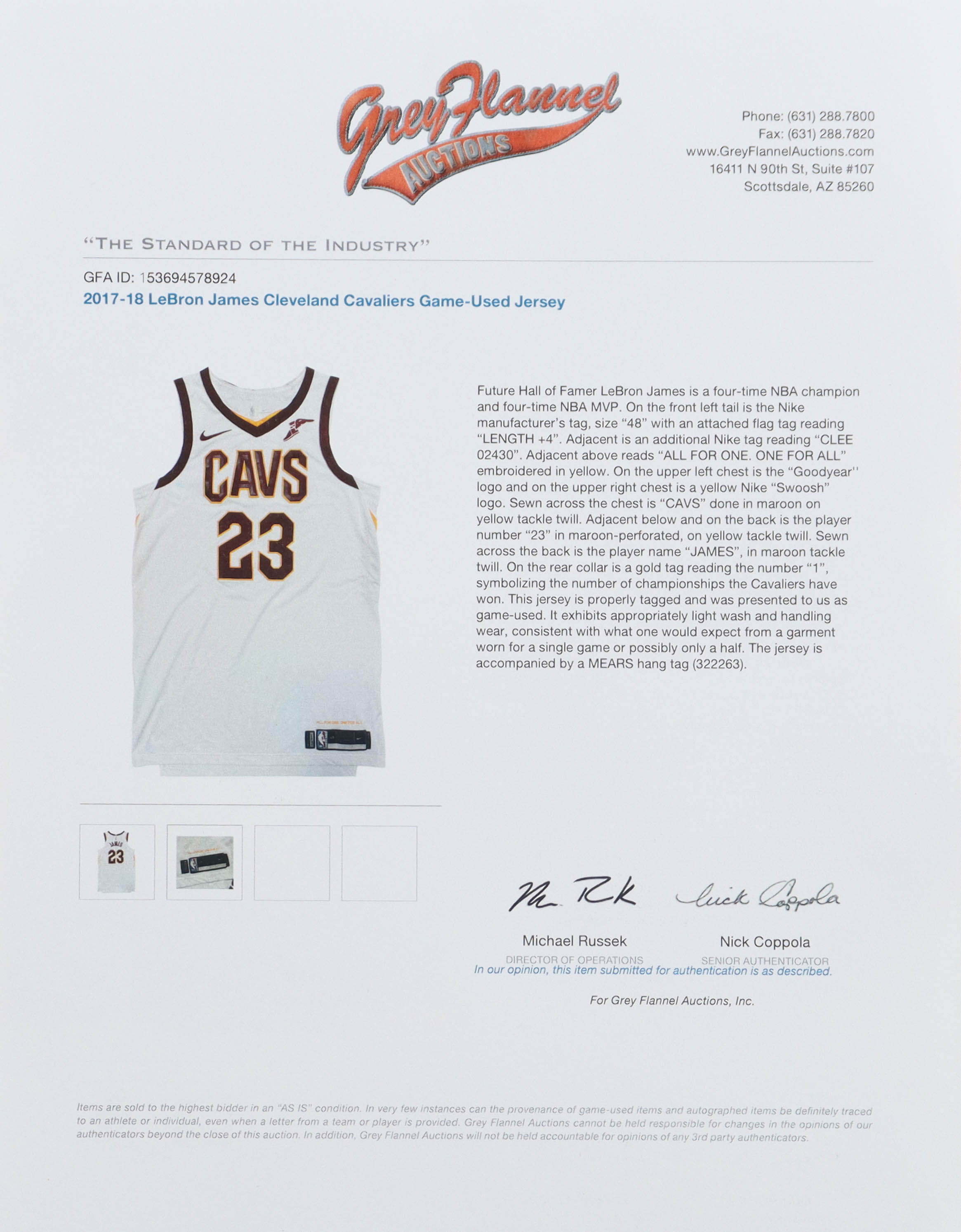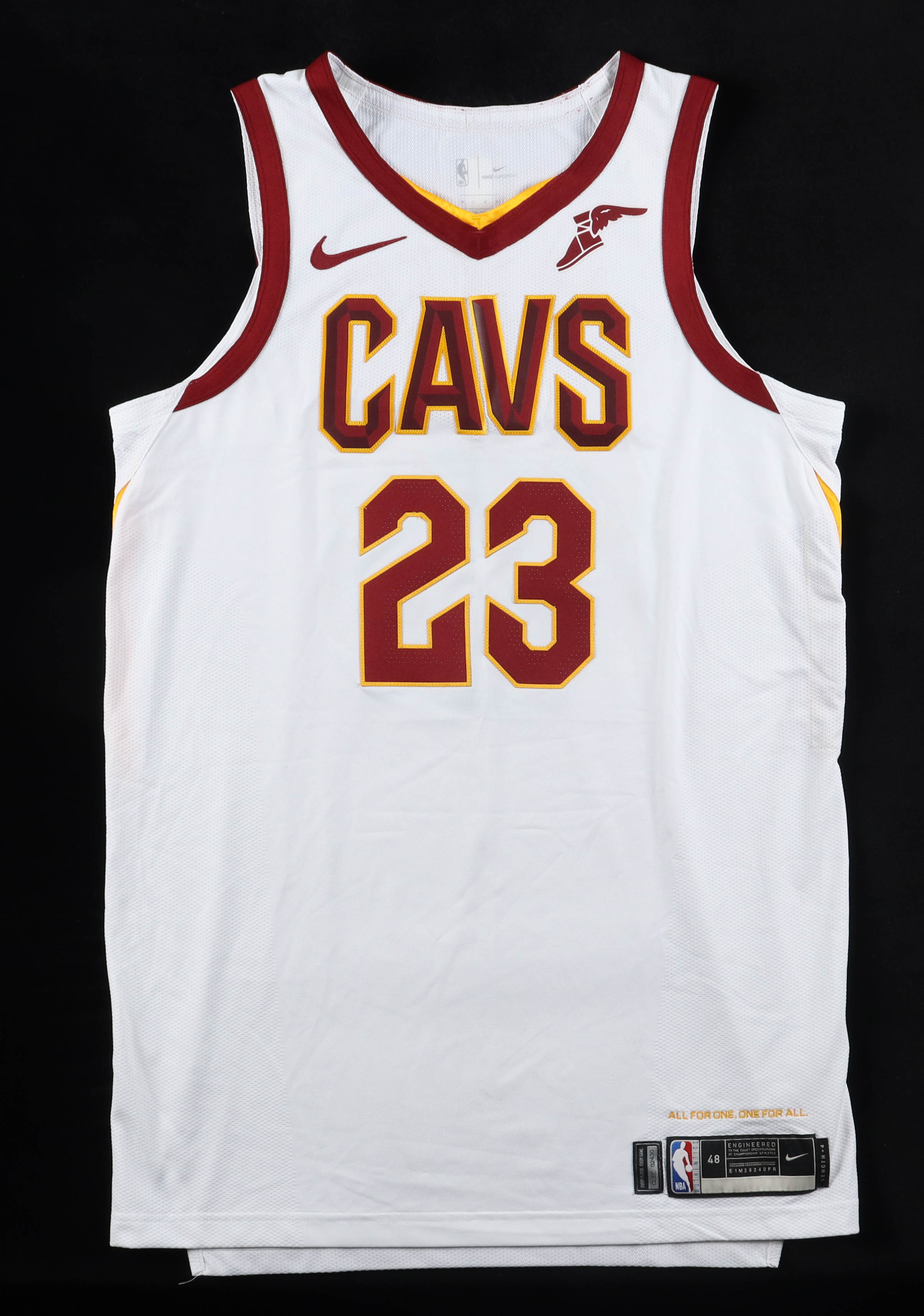 Authentic Nike jersey, size 48 (Length +4). The jersey was game-used by LeBron James during the 2017-18 season. The jersey shows minimal wear. (Cleveland Cavaliers).