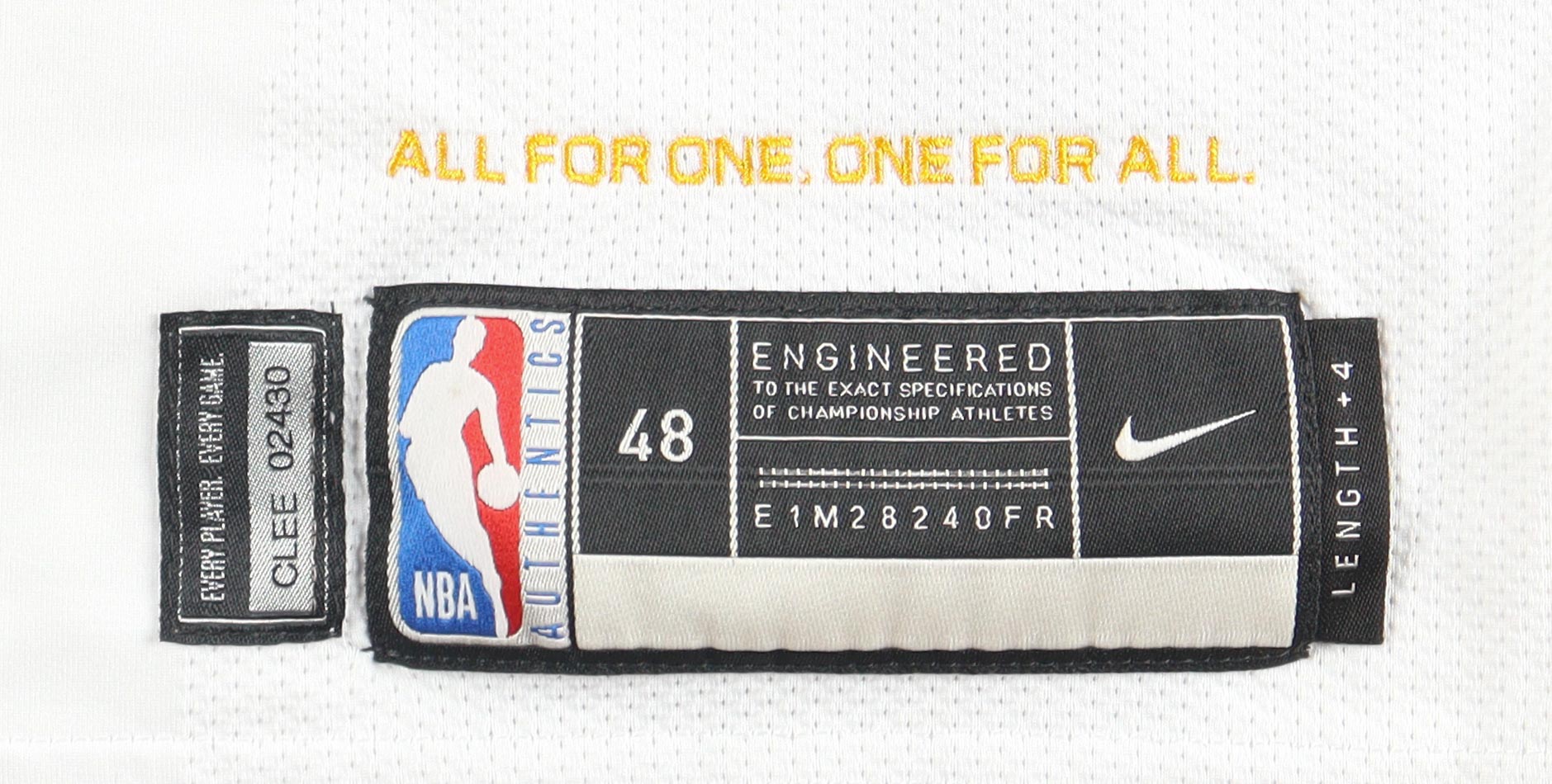 -Nike tag reading "CLEE 02430". Adjacent above reads "ALL FOR ONE. ONE FOR ALL" embroidered in yellow.