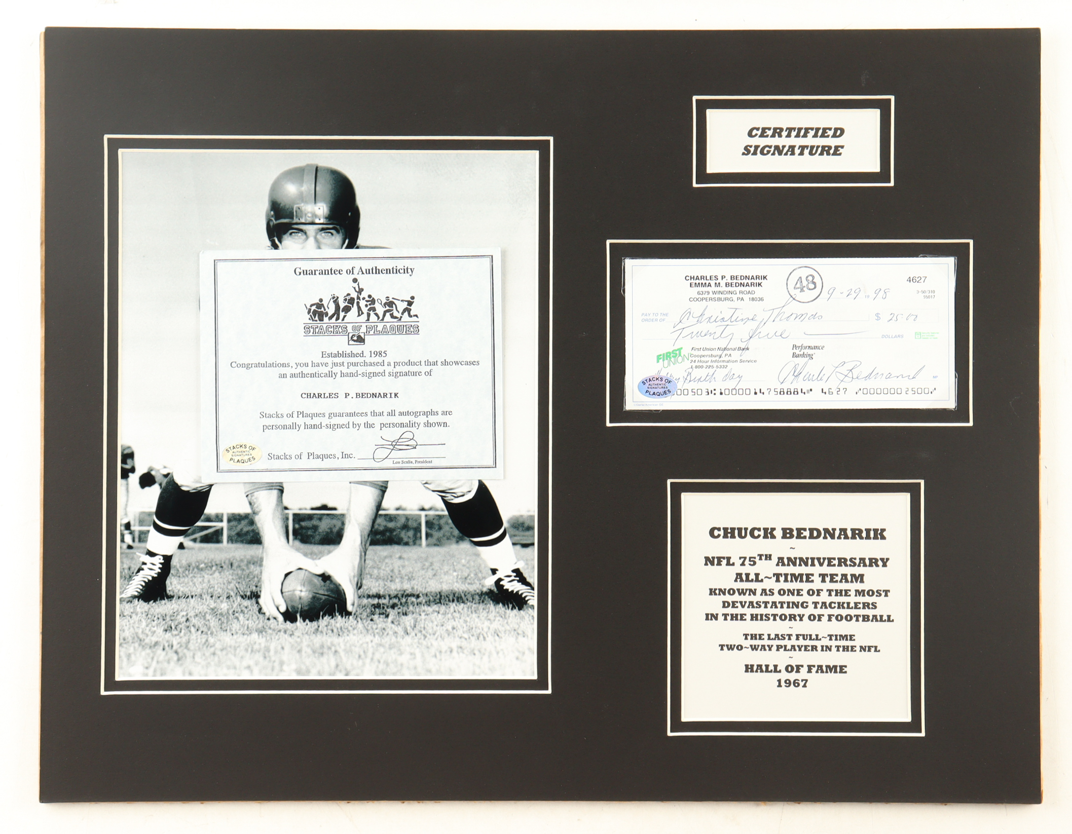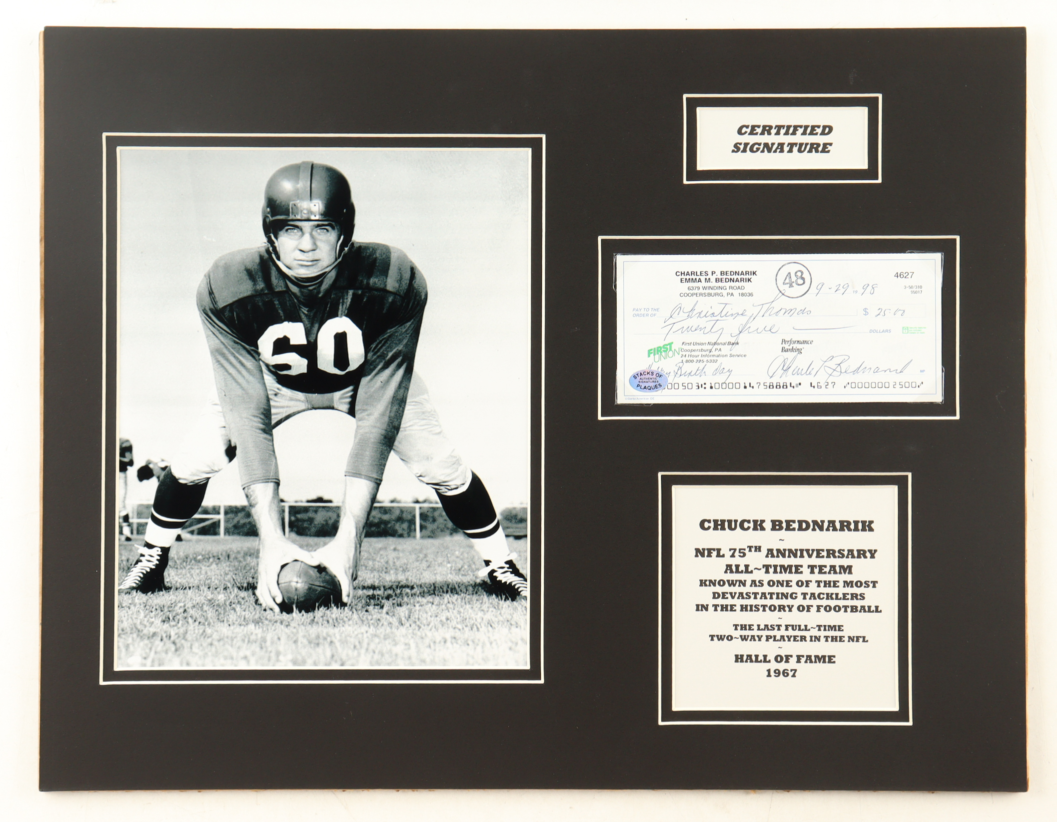Custom check display measures approximately 14" x 18" in size and features a check dated September 29th, 1998 that has been hand-signed by Chuck Bednarik (D. 2015, Philadelphia Eagles, HOF).
