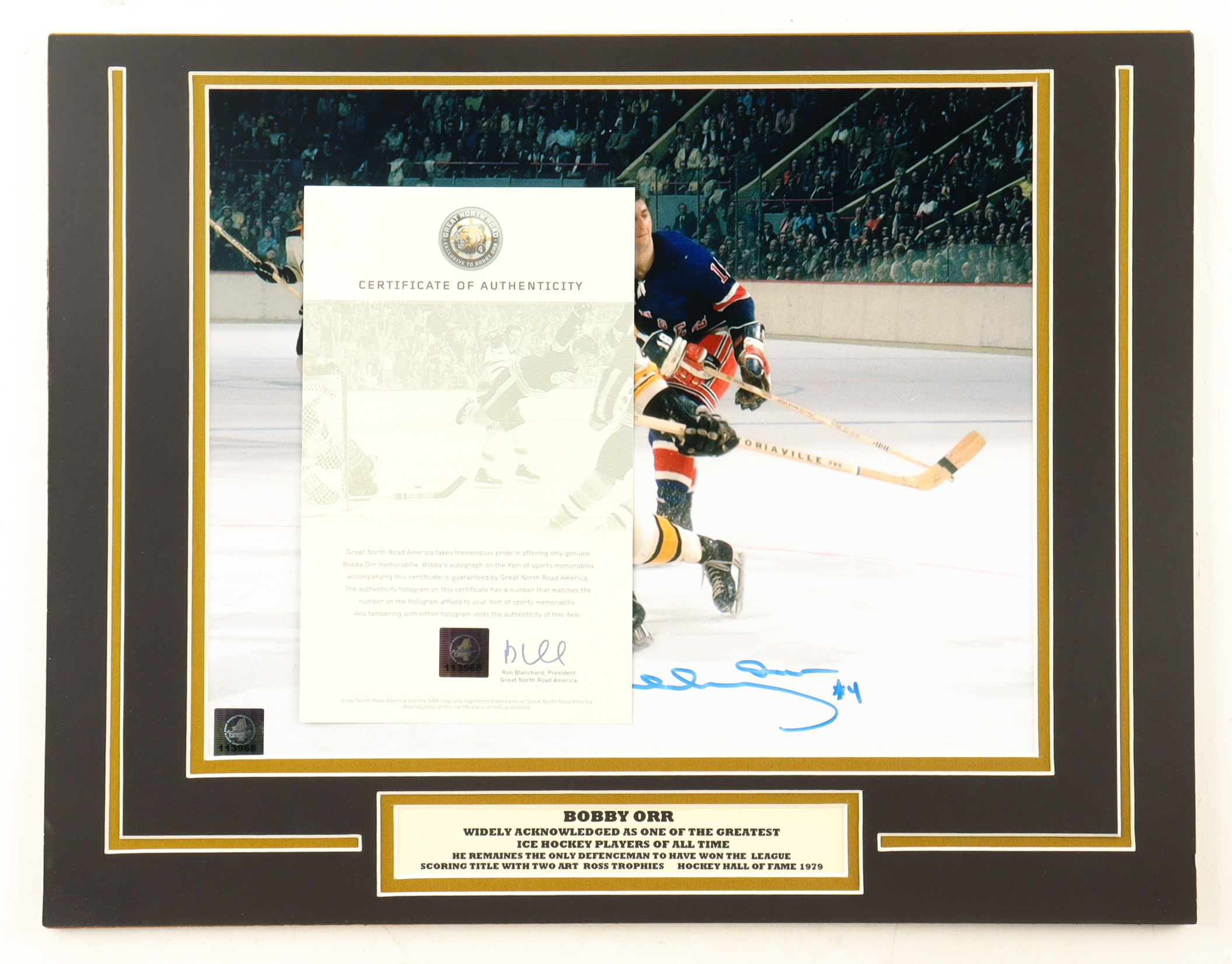 Custom photo display measures approximately 14" x 18" in size and features a photo that has been hand-signed by Bobby Orr (Boston Bruins, HOF).