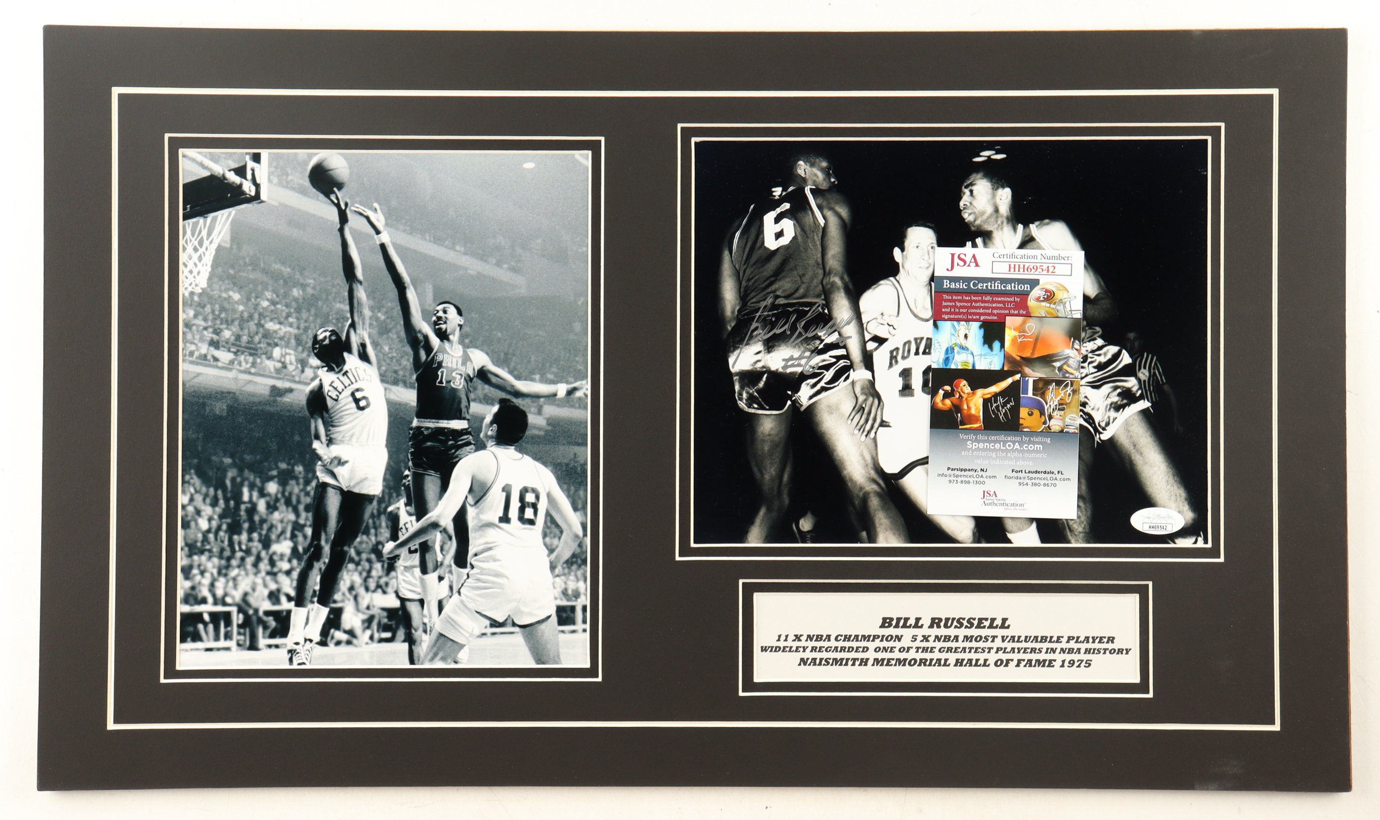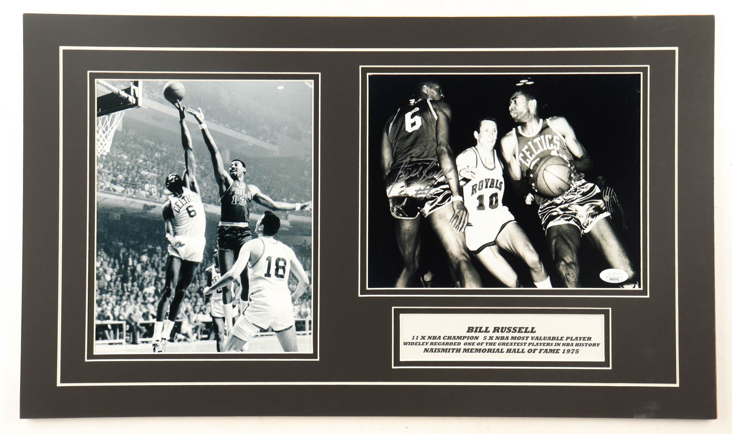 Custom photo display measures approximately 14" x 24" in size and features a photo that has been hand-signed by Bill Russell (D. 2022, Boston Celtics, HOF).