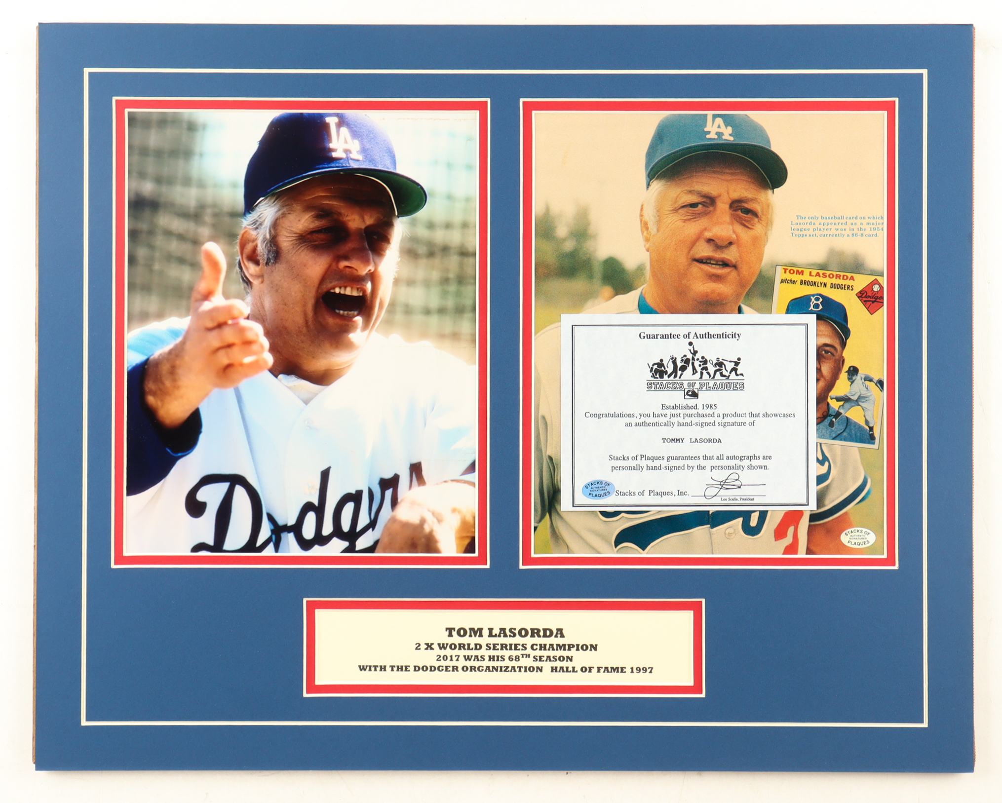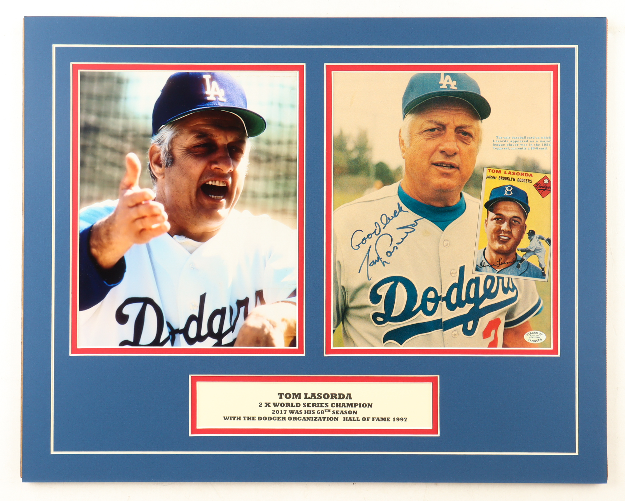 Custom photo display measures approximately 16" x 20" in size and features a photo that has been hand-signed and inscribed by Tom Lasorda (D. 2021, Brooklyn Dodgers, HOF).