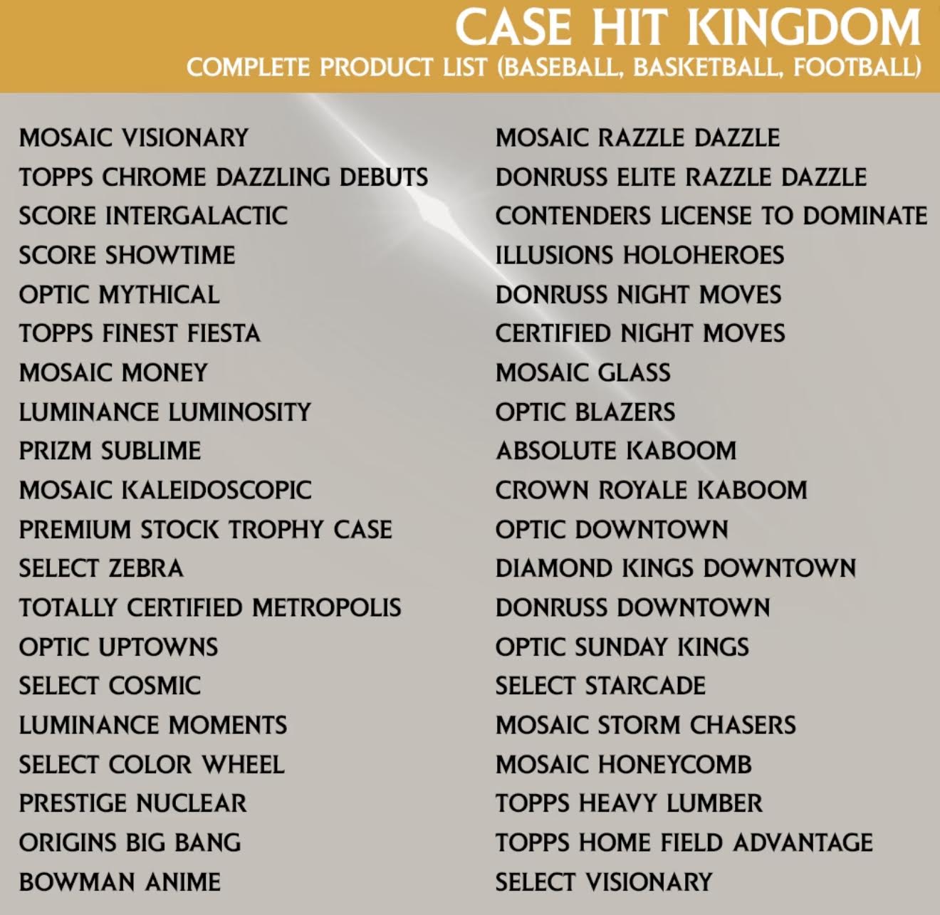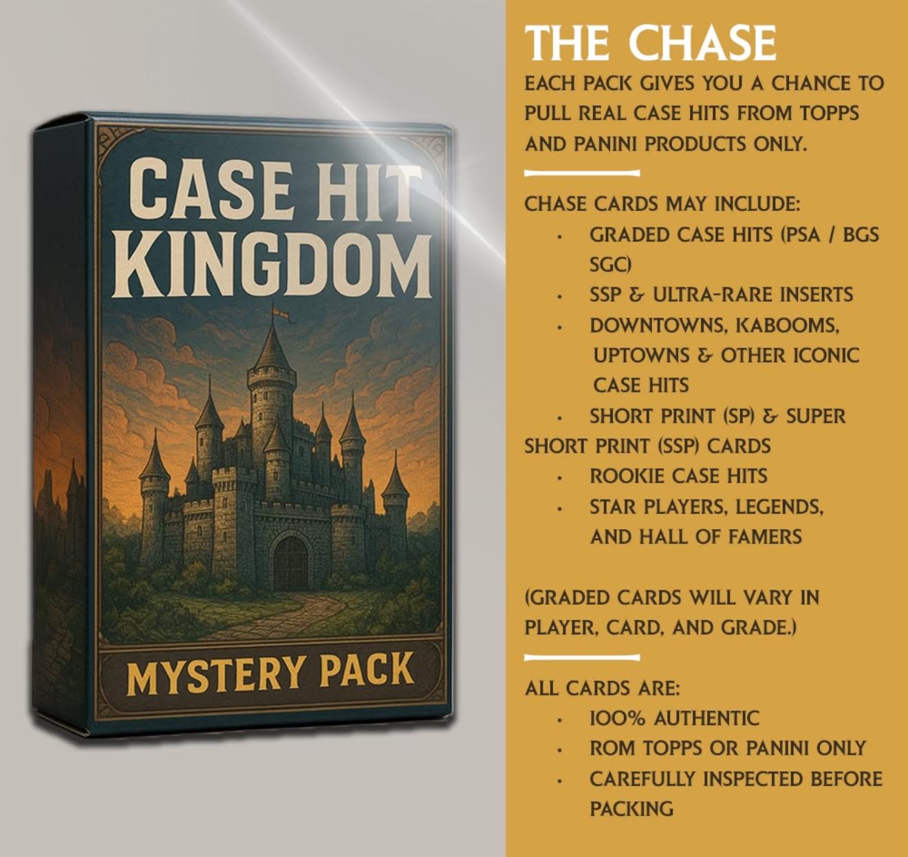 Welcome to Case Hit Kingdom, a mystery repack product built for collectors who chase the biggest hits in the hobby. This product delivers true case-hit cards across the three most collectible sports - Football, Basketball, and Baseball. Every card is carefully selected to provide excitement, value, and a legitimate chance at premium hits.
