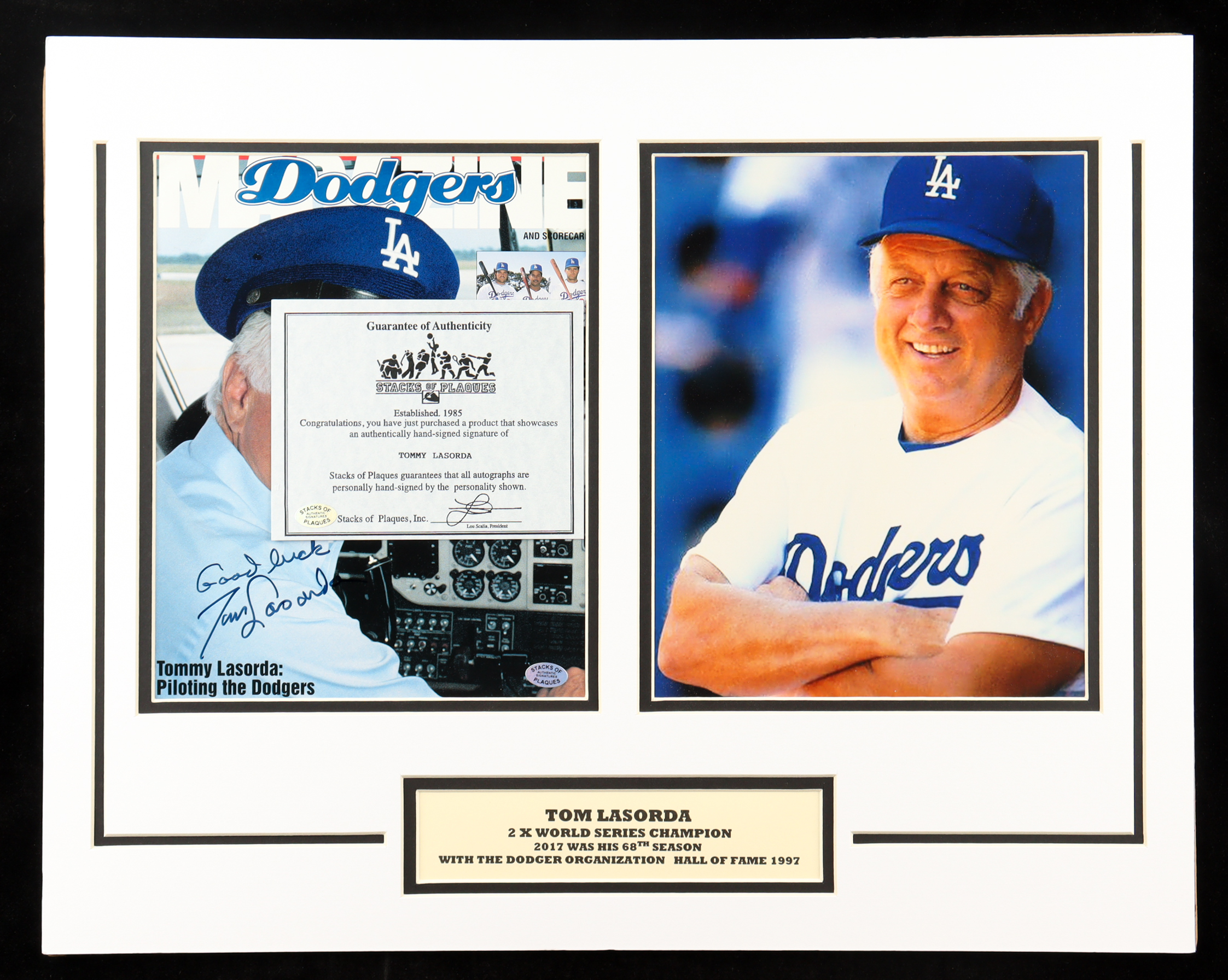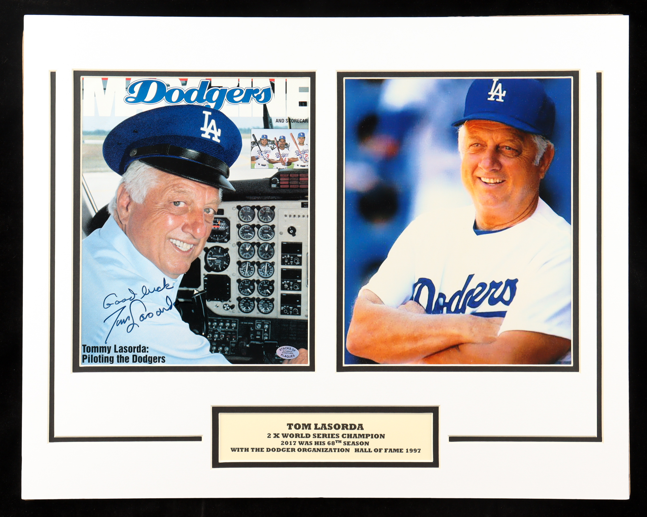 Custom photo display measures approximately 16" x 20" in size and features a photo that has been hand-signed and inscribed by Tom Lasorda (D. 2021, Brooklyn Dodgers, HOF).