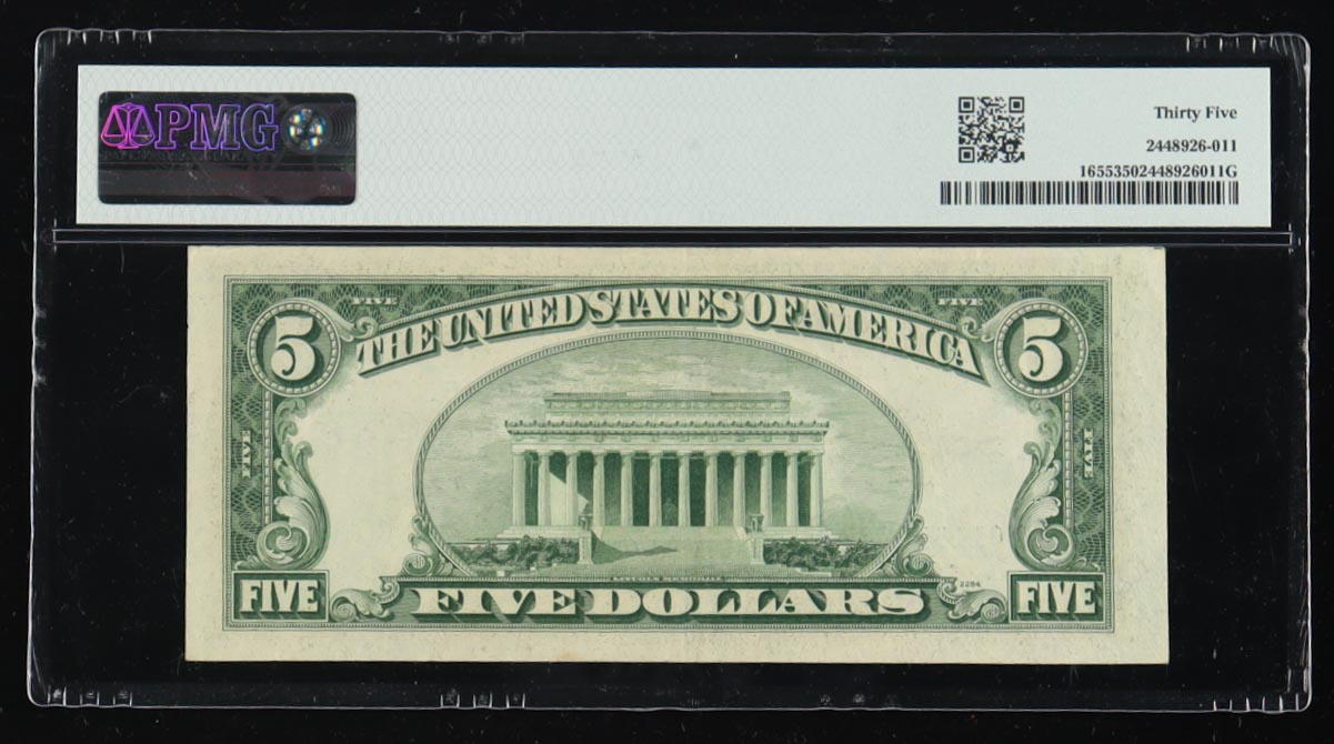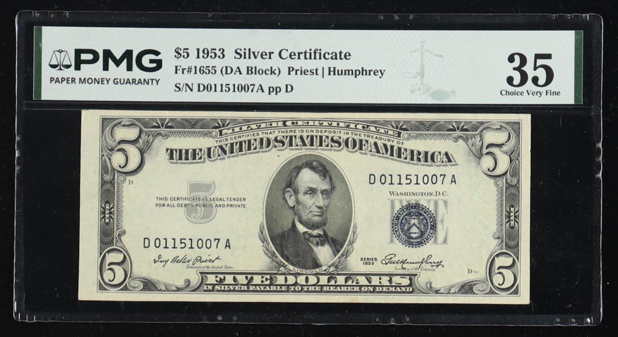 1953 U.S. $5 Silver Certificate, Blue Seal - Fr. 1655 (DA Block) Signed: Priest / Humphrey (PMG Choice Very Fine 35)