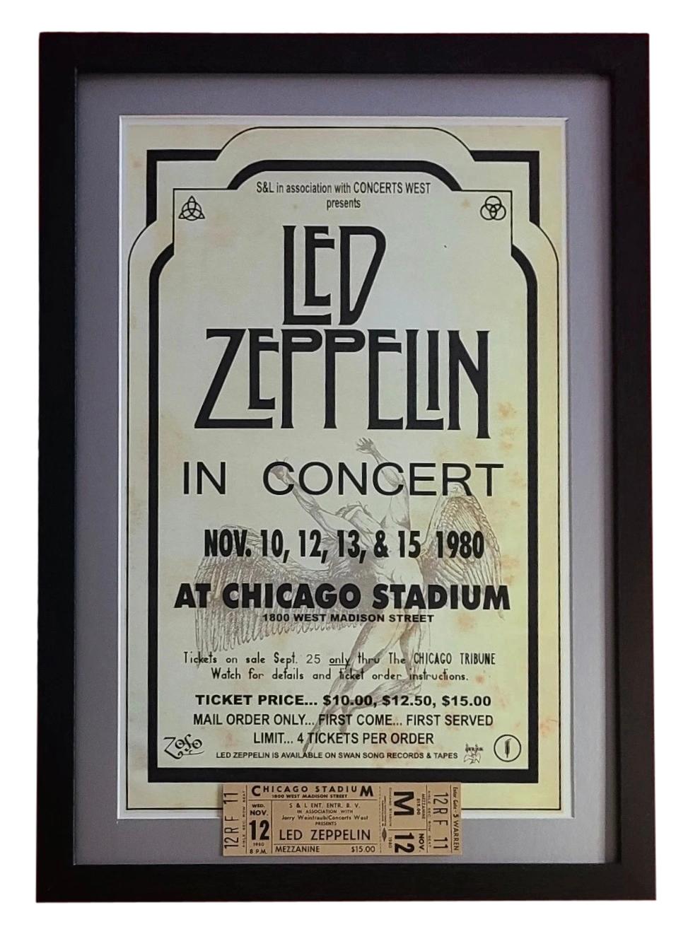 Led Zeppelin Custom Framed Display with Original 1980 Concert Ticket & Chicago Stadium Letter of Provenance