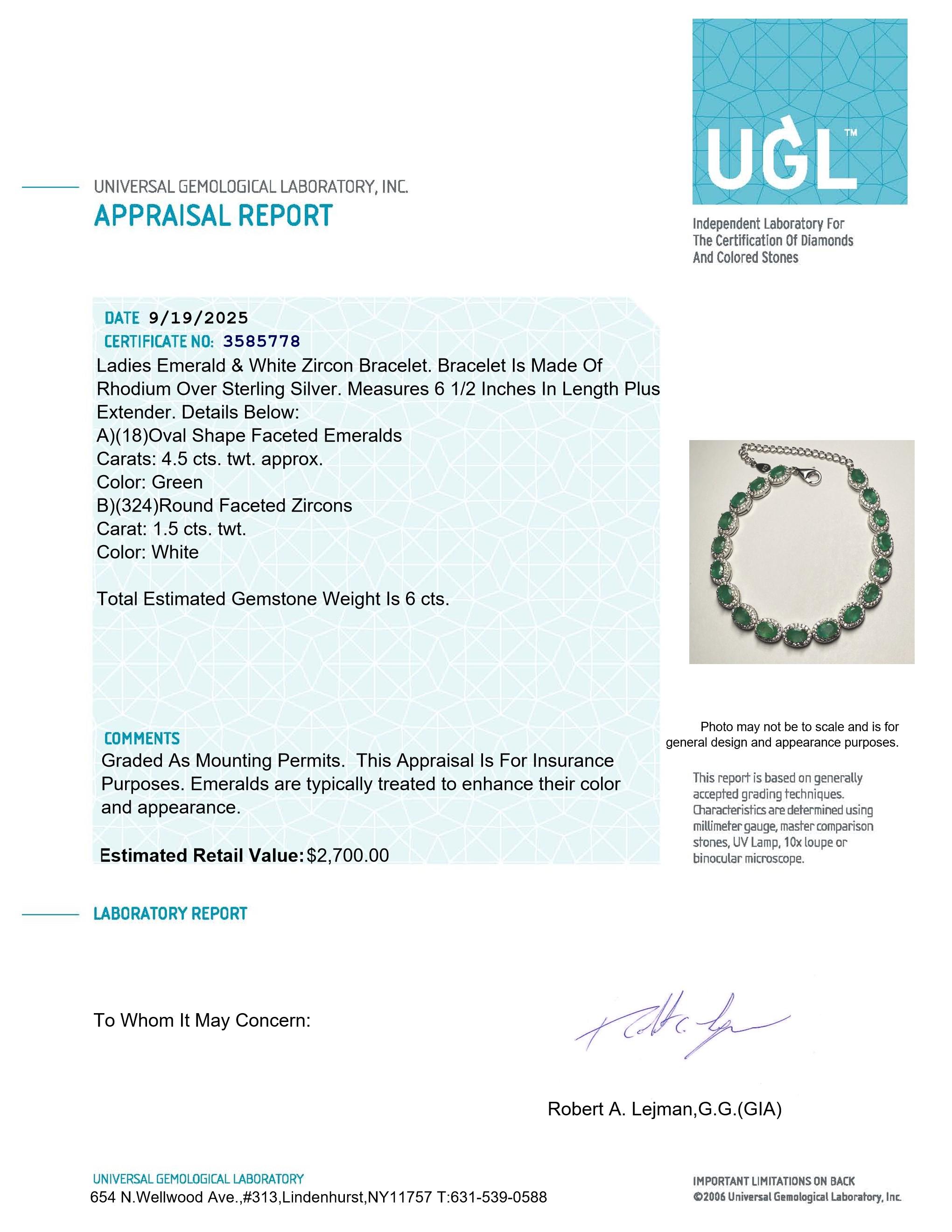 Ladies emerald and white zircon bracelet crafted in rhodium over sterling silver. This elegant bracelet features a continuous line of oval faceted emeralds accented by round white zircons for added brilliance. Designed for comfortable wear with an extender for adjustable length. Includes UGL appraisal documentation.