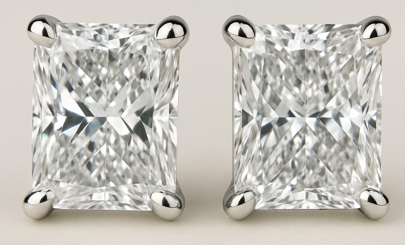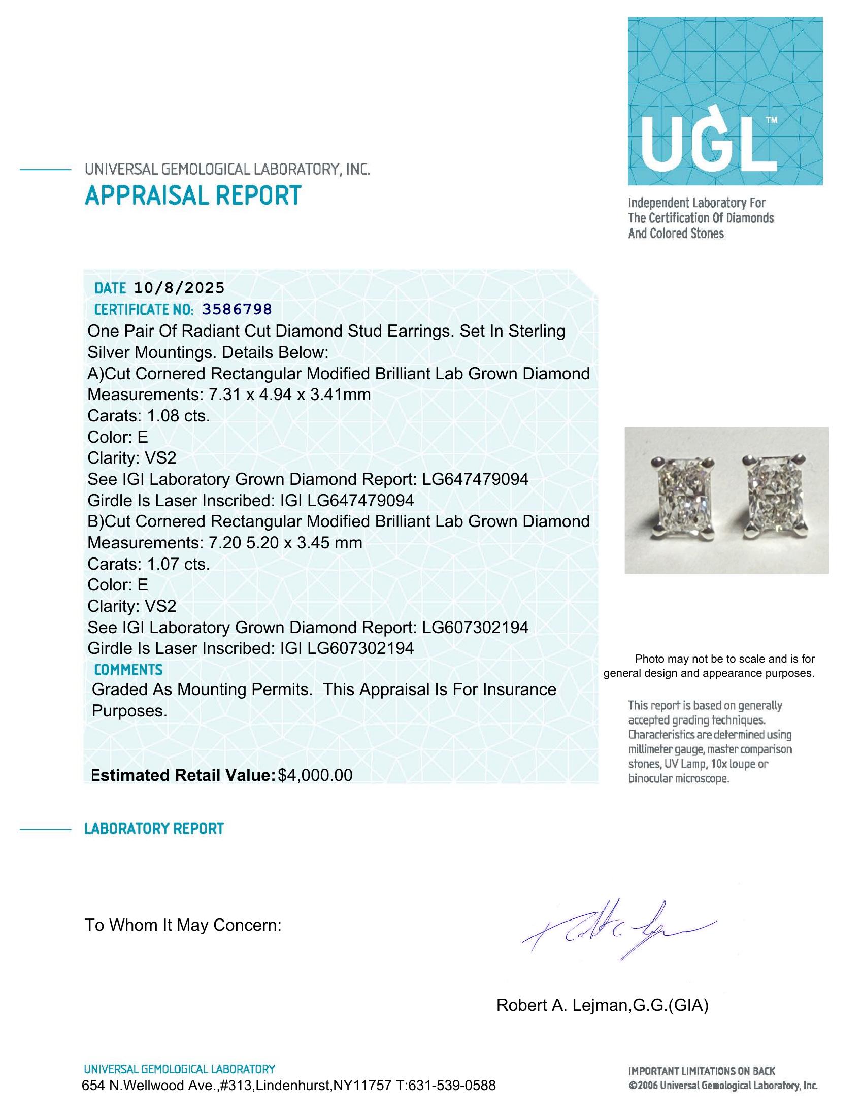 2.15 Carats Lab Grown Diamond Stud Earrings E, VS2 | $4,000 Estimated Retail Value (UGL & IGI Certs) | Brand New | Radiant Cut