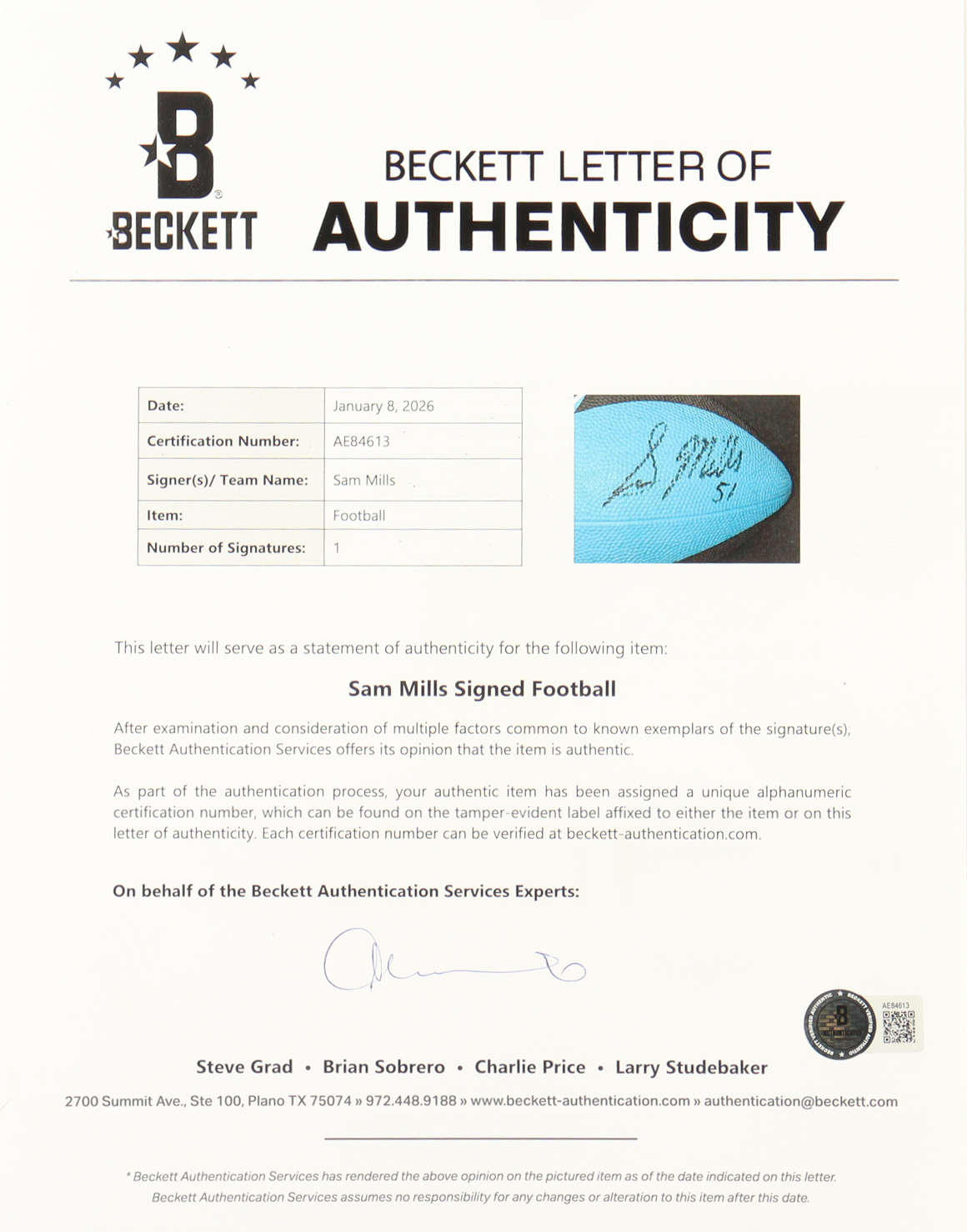 Burger King Carolina Panthers logo football has been hand-signed by Sam Mills (D. 2005, HOF). Please note, the white signature is a facsimile and there are scuffs throughout, see photos for more details.