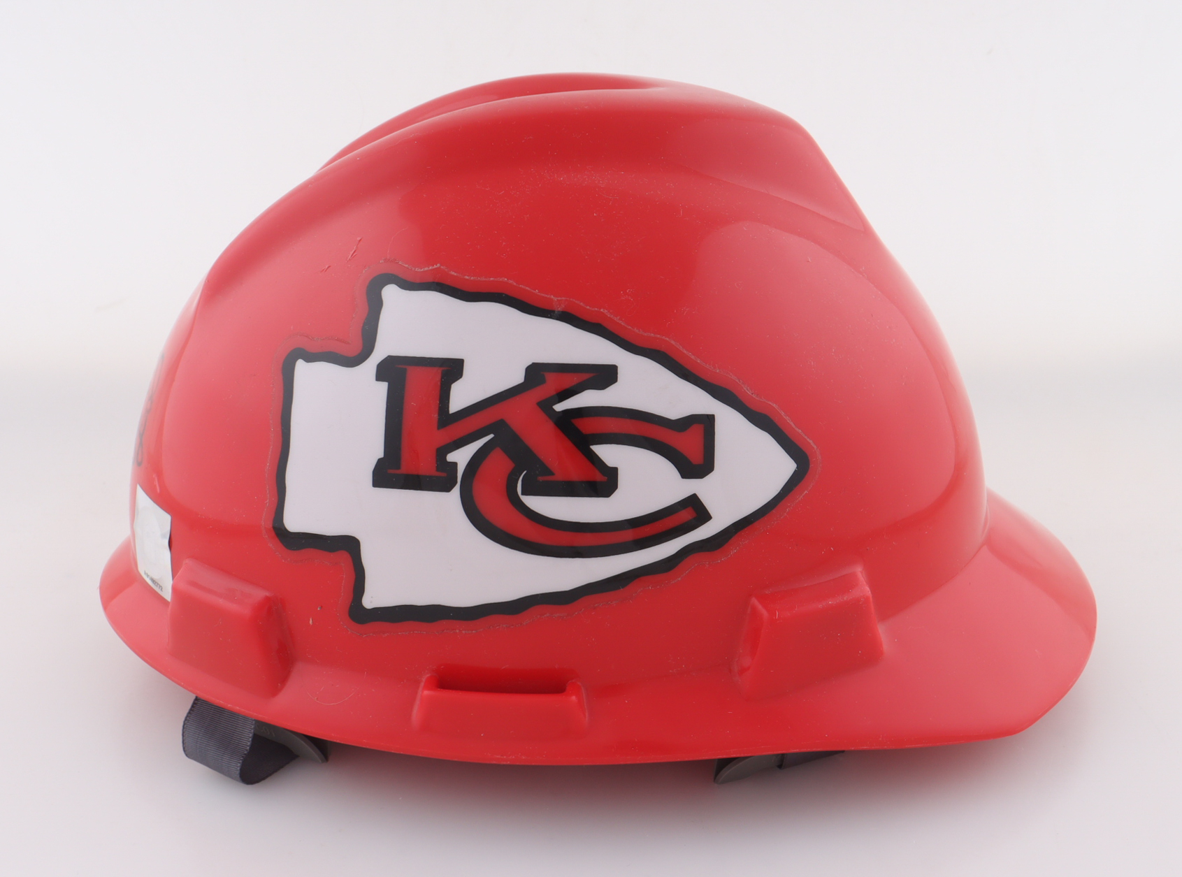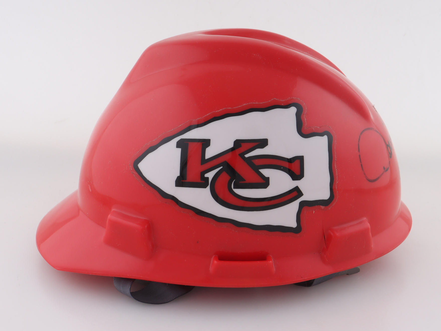 Kansas City Chiefs Full-Size Hard Hat helmet has been hand-signed by Derrick Thomas (D. 2000, HOF). Please note the signature is smudged.