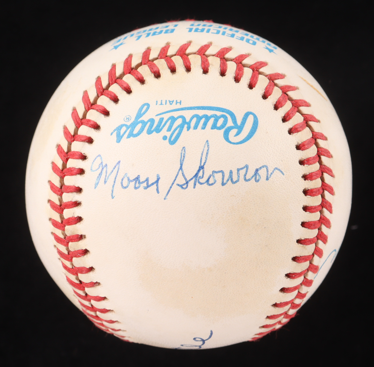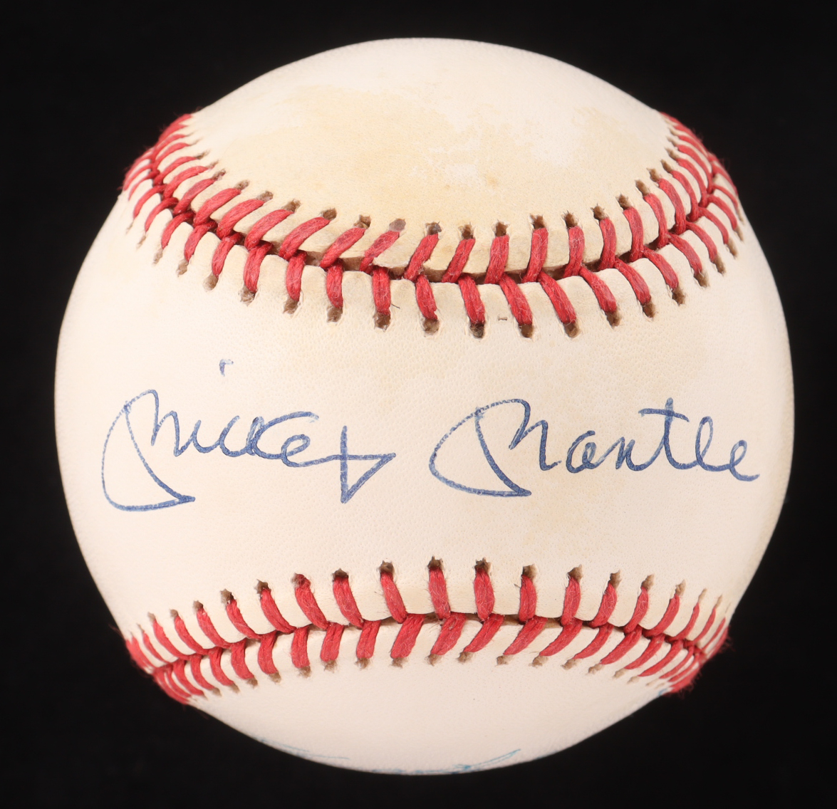 Rawlings Official American League baseball has been hand-signed by Mickey Mantle (D. 1995, New York Yankees, HOF), Bill Skowron (D. 2012), and Hank Bauer (D. 2007).