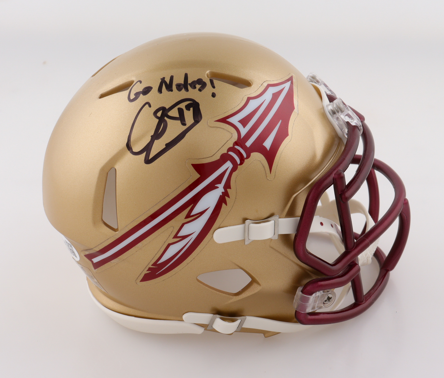 Schutt Florida State Seminoles mini helmet. Hand-signed and inscribed by Charlie Ward.