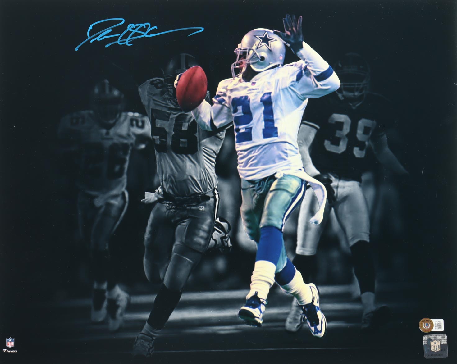 Photo measures 16" x 20" in size and has been hand-signed by Deion Sanders (Dallas Cowboys, HOF).