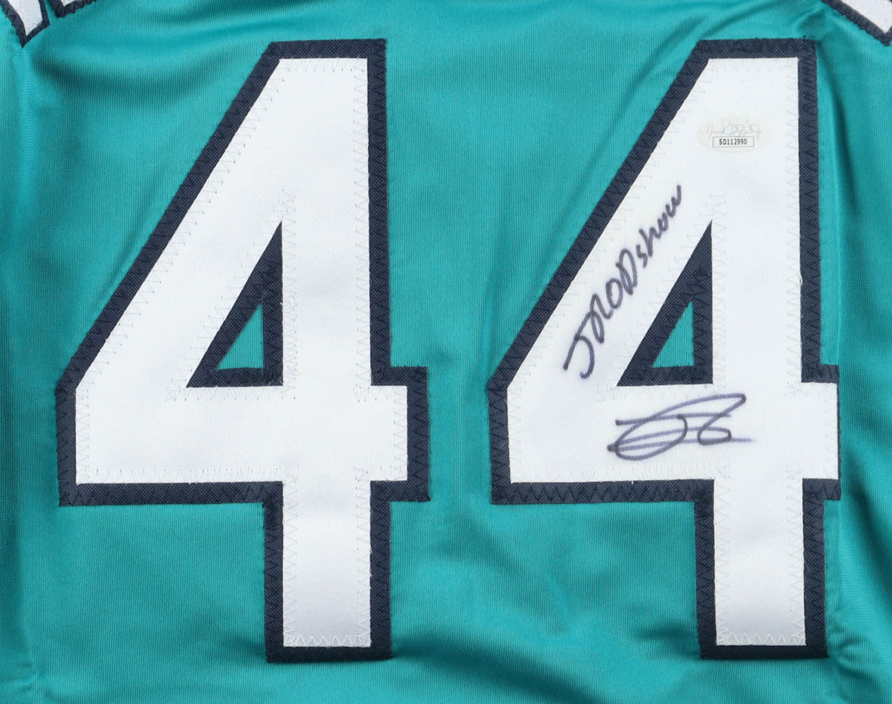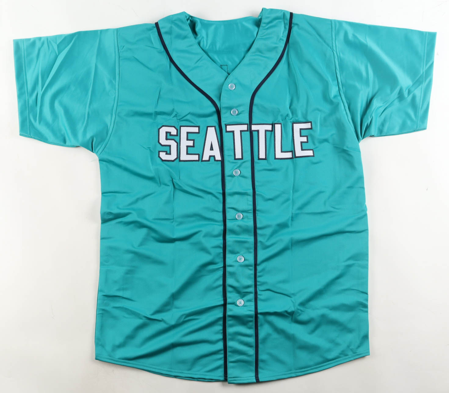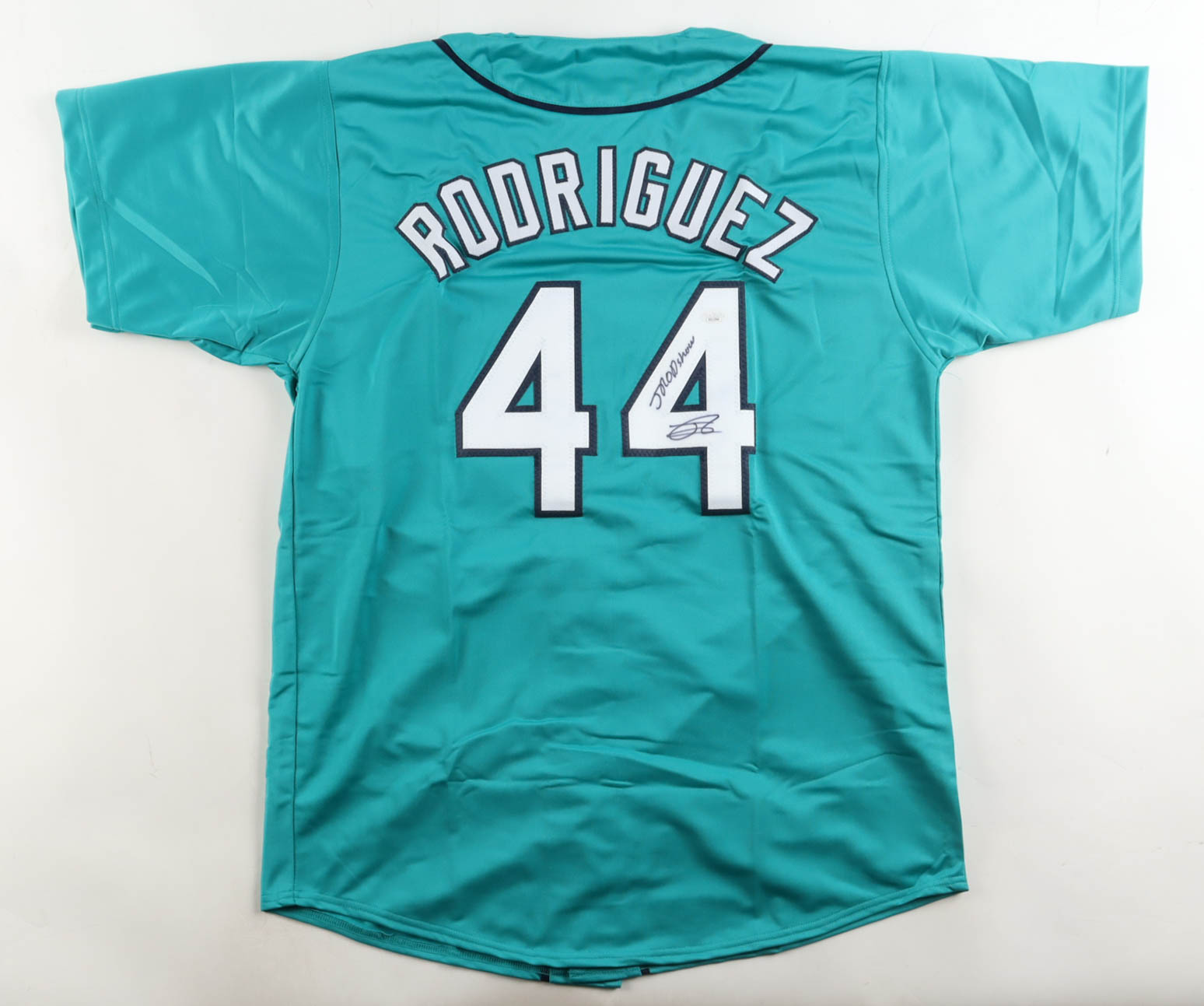 Custom jersey. Everything is sewn on, size XL. Hand-signed by Julio Rodriguez. Please note, the signature and inscription have bled.