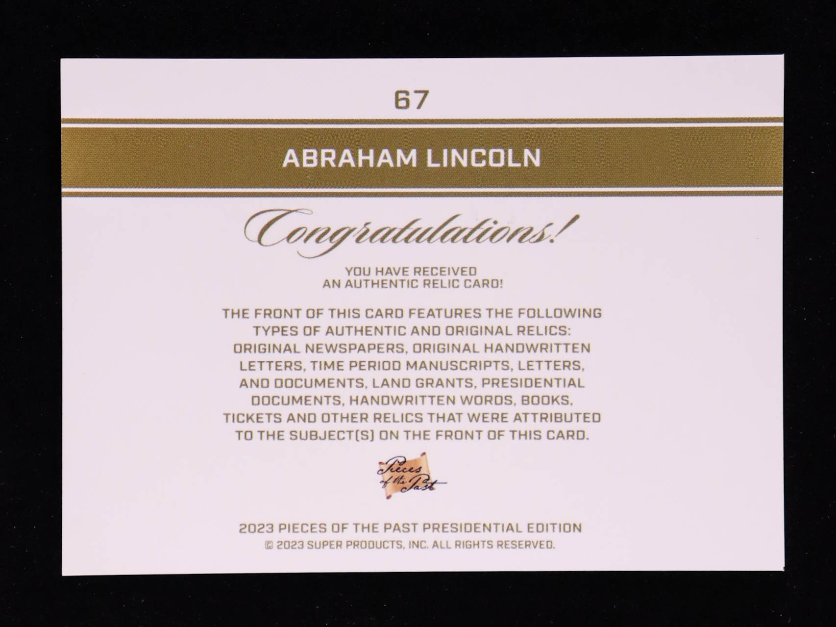 Abraham Lincoln 2023 Pieces of the Past Pieces Relic #67