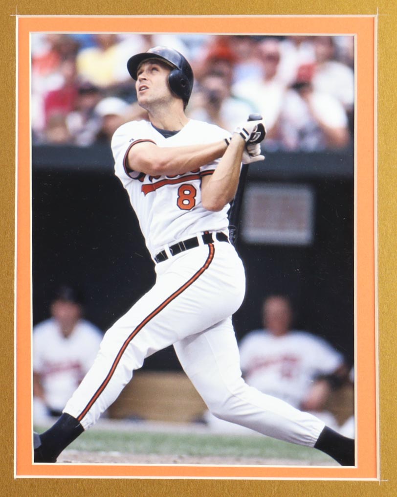 Custom frame display measures approximately 32" x 36" in size and features a jersey and a cut that has been hand-signed by Cal Ripken Jr. (D. 2014, Baltimore Orioles, HOF). The display also includes a Hall of Fame Induction pin, (2) 8" x 10" photos and (2) cloth team logo patches.