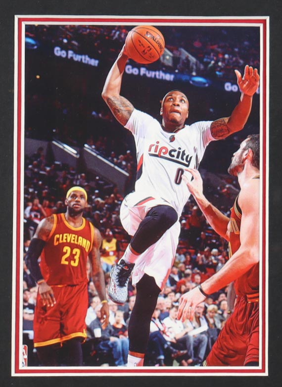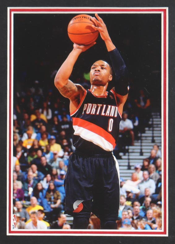 Custom frame measures 32" x 37" in size and features a jersey hand-signed by Damian Lillard. Display also features (2) 8" x 10" photos that may be in reverse order. Please see photos for details regarding the condition of the item.