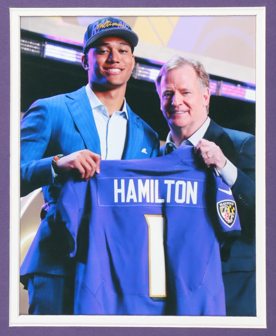 Custom frame measures 35" x 42" in size and features a jersey hand-signed by Kyle Hamilton. Display also features (2) 8" x 10" photos that may be in reverse order as well as a jumbo Baltimore Ravens team logo emblem. Please see photos for details regarding the condition of the item as the frame shows signs of slight damage.