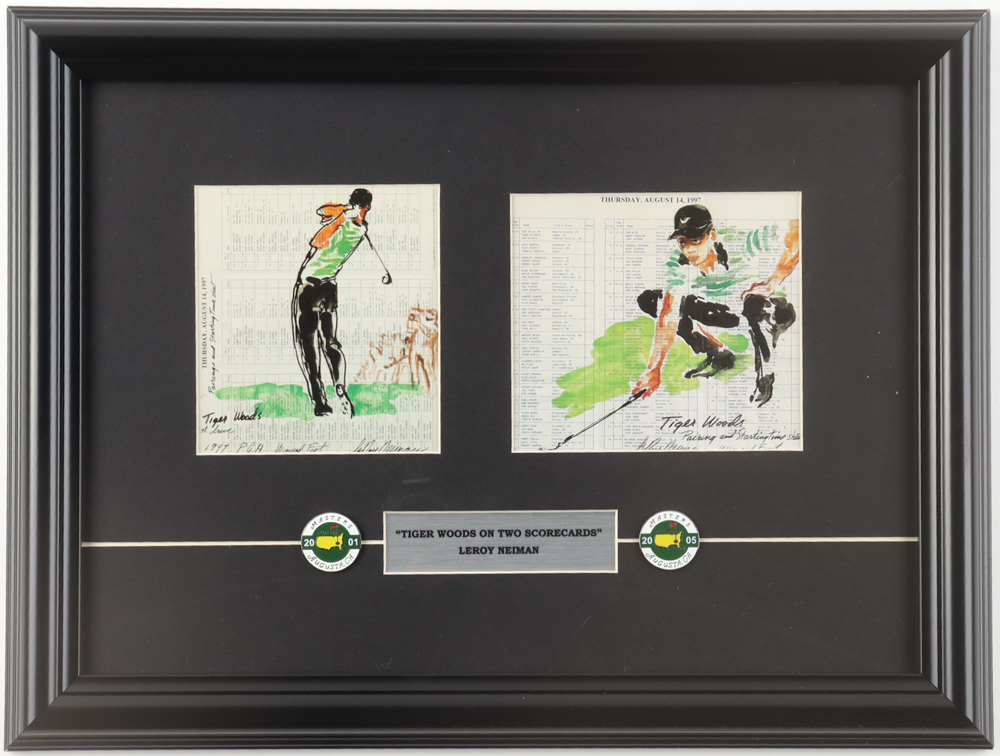 LeRoy Neiman Matching Set of (2) Tiger Woods Custom Framed Art Prints Display with (2) Masters Champion Year Pins