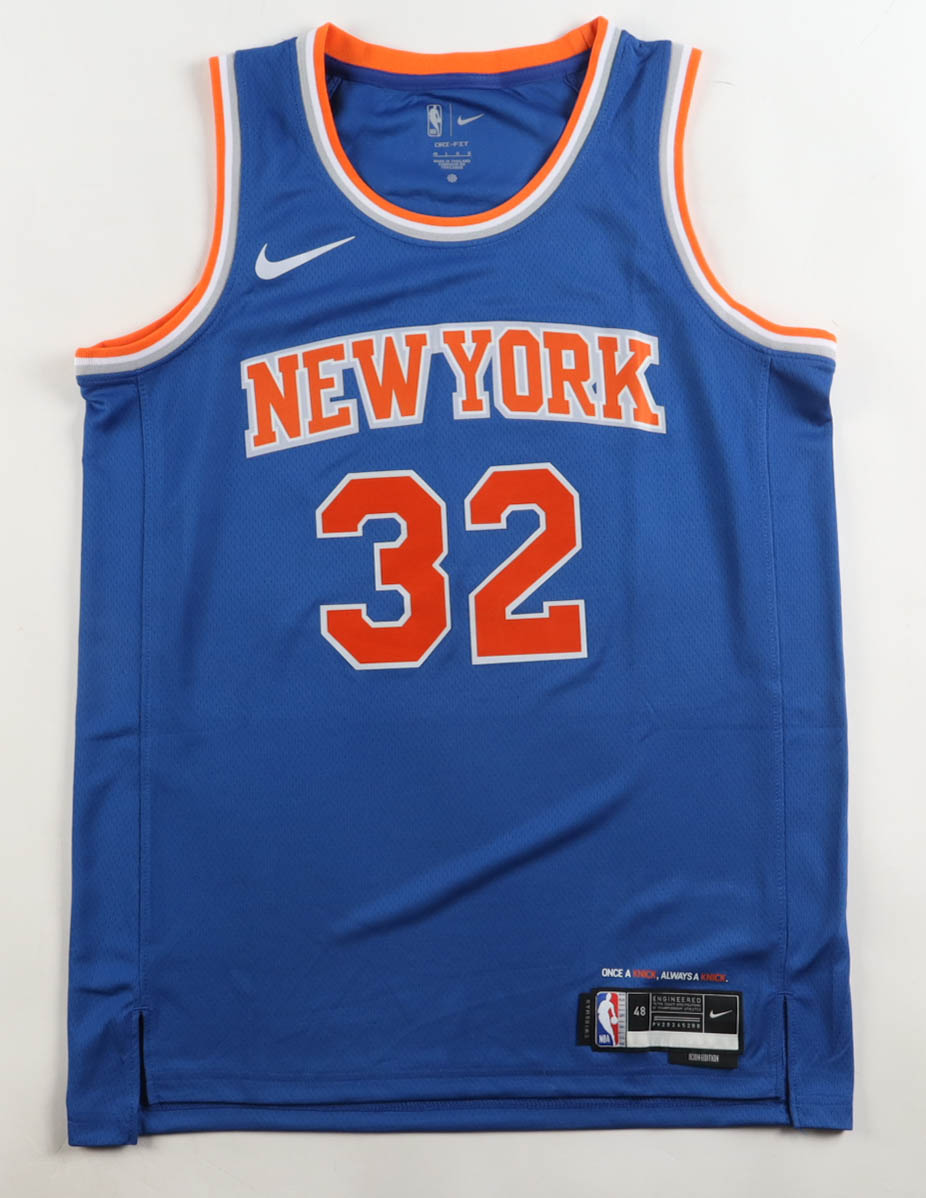 Nike authentic jersey with everything pressed on, size 48. Hand-signed by Karl-Anthony Towns (New York Knicks).