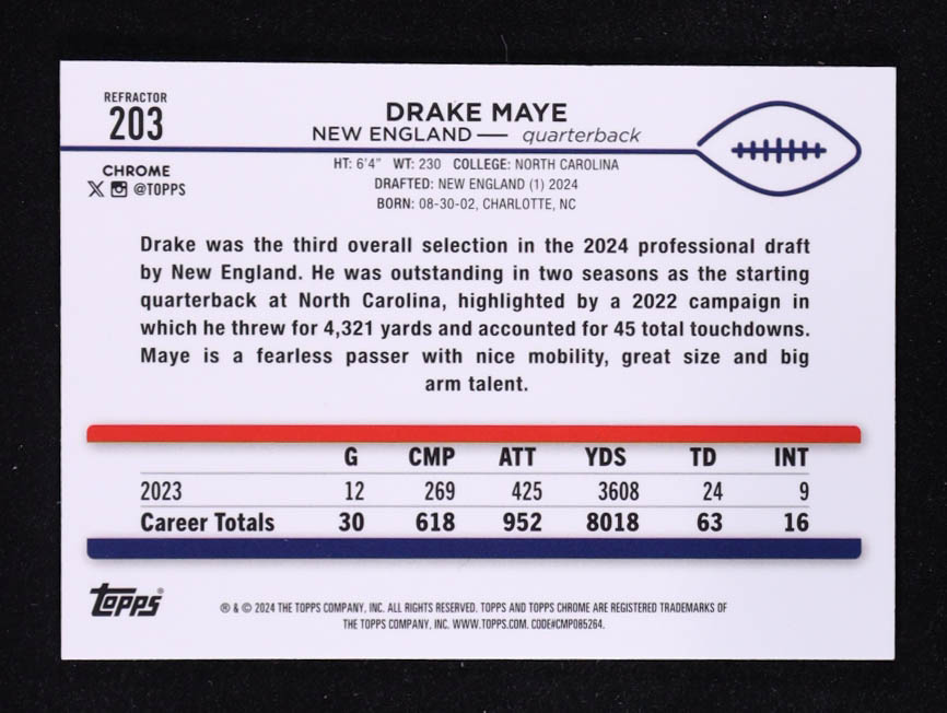 Drake Maye 2024 Topps Chrome Refractors #203 RC
