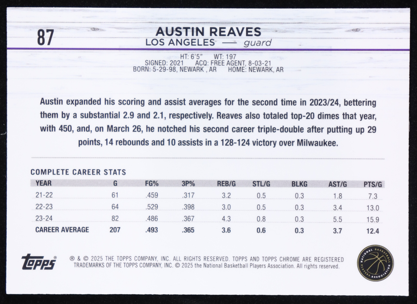 Austin Reaves 2025 Topps Chrome Purple Sonar Refractors #87 #170/275