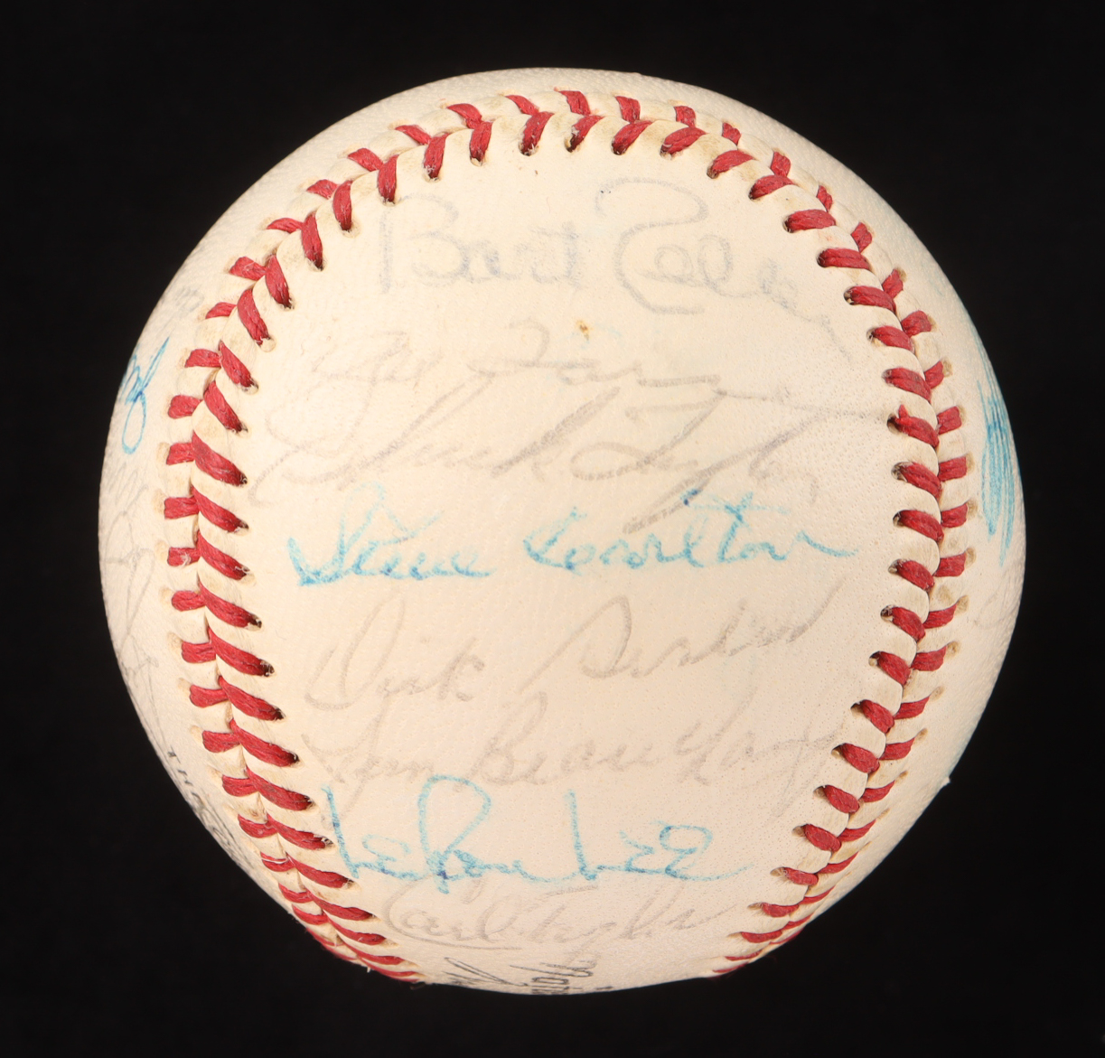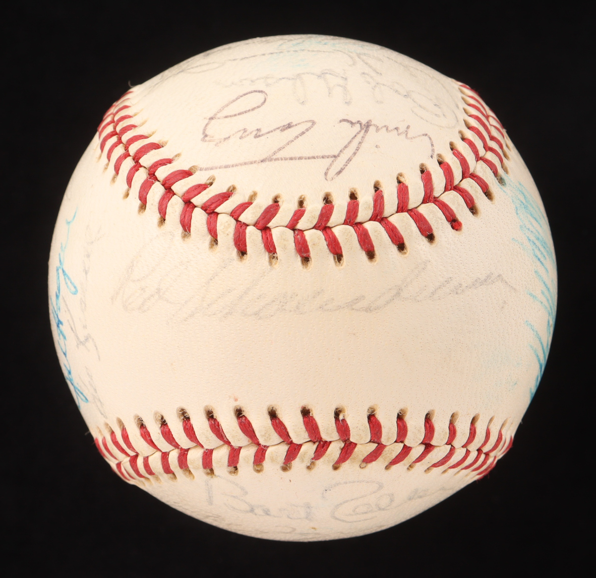 Please note, the baseball is naturally toned and stained, and the signatures are fading.