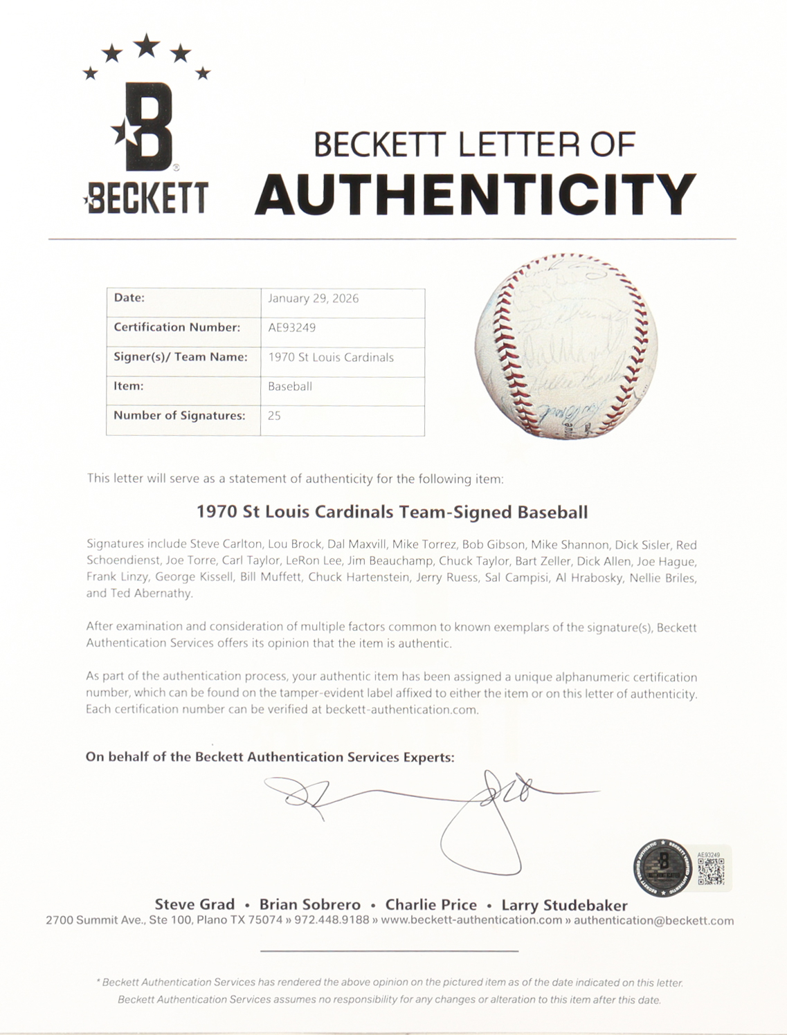1970 St. Louis Cardinals | ONL Baseball Signed by (25) with Lou Brock, Red Schoendienst, Joe Torre, Steve Carlton (Beckett)