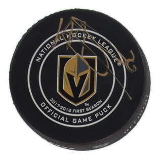 Las Vegas Golden Knights logo hockey puck has been hand-signed by Malcolm Subban. Please note the fading signature.