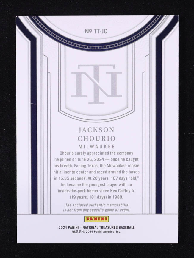Jackson Chourio 2024 Panini National Treasures Treasured Threads #10 #19/99 RC