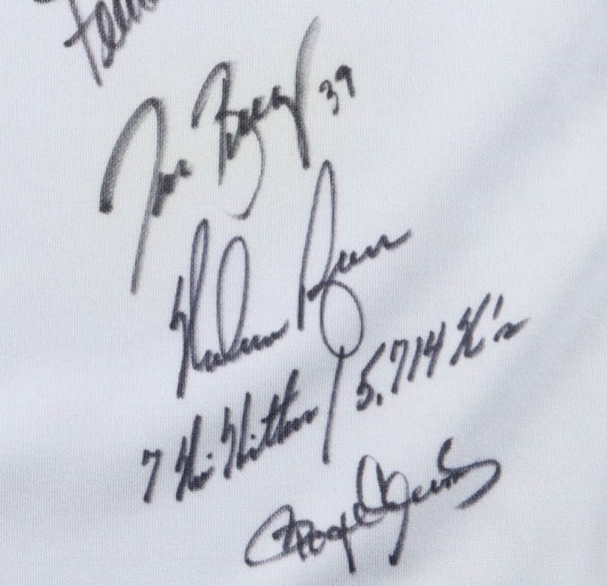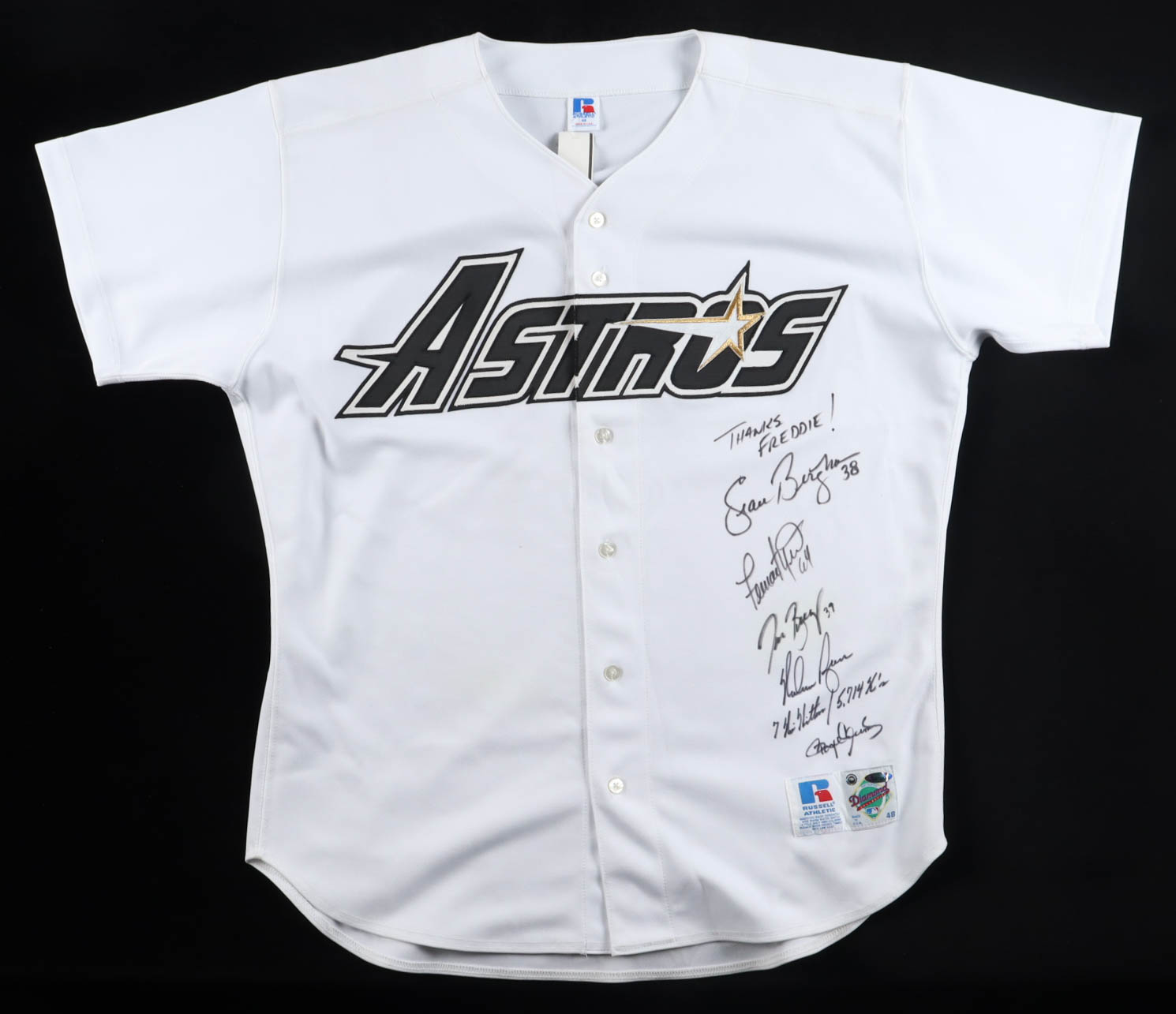 Houston Astros Russell Athletic jersey size 48 has been hand-signed and inscribed by Nolan Ryan, Roger Clemens, Sean Bergman, Fernando Nieve and Taylor Buchholz.