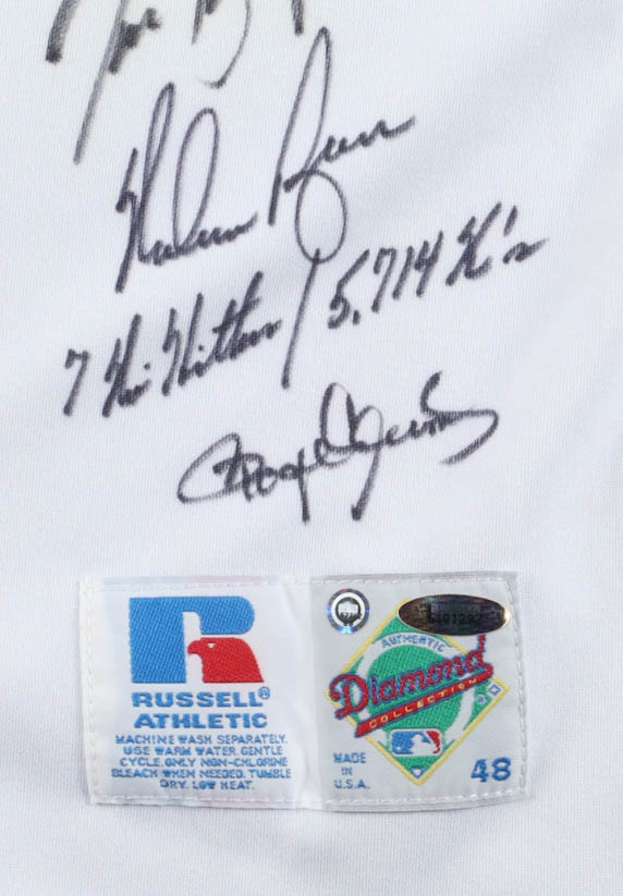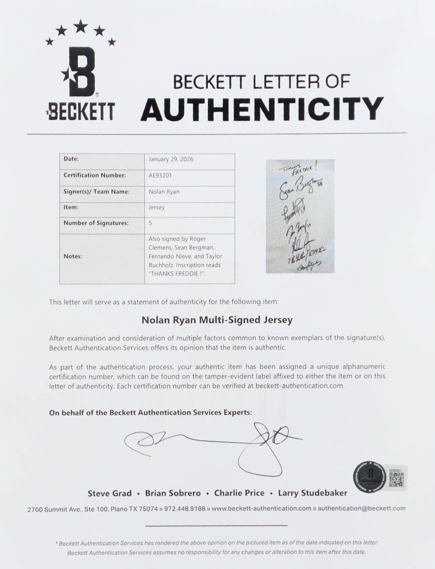 Astros Legendary Pitchers Jersey Signed By (5) With Nolan Ryan, Roger Clemens, Sean Bergman, Fernando Nieve Inscribed "7 No-Hitter / 5,714 K's" & "Thanks Freddie" (Beckett)