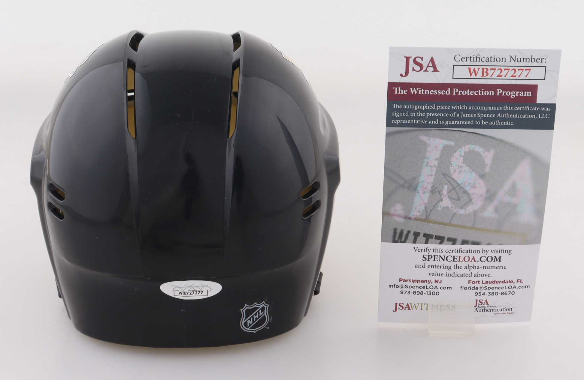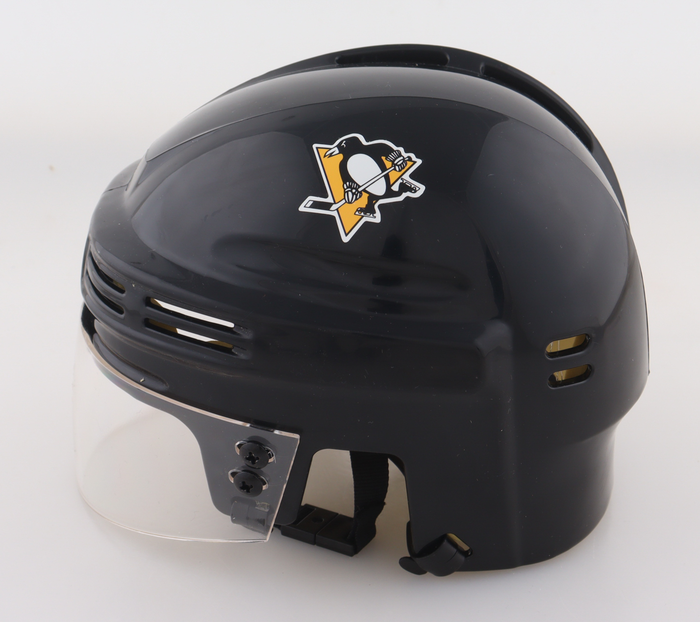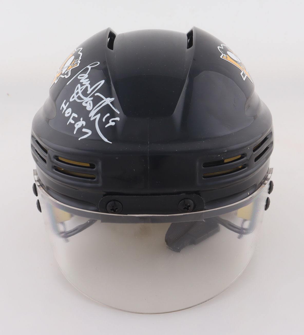 Pittsburgh Penguins mini hockey helmet has been hand-signed and inscribed by Bryan Trottier (HOF).