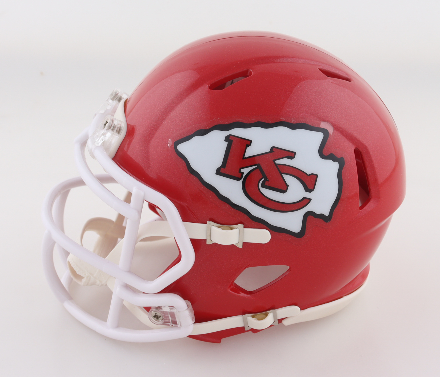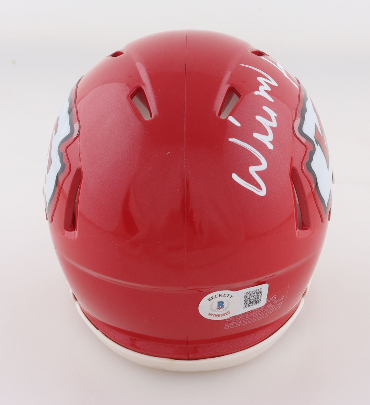 Riddell Kansas City Chiefs speed mini helmet. Hand-signed and inscribed by Willie Roaf (HOF).