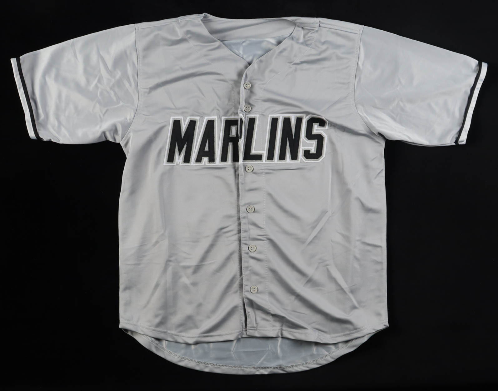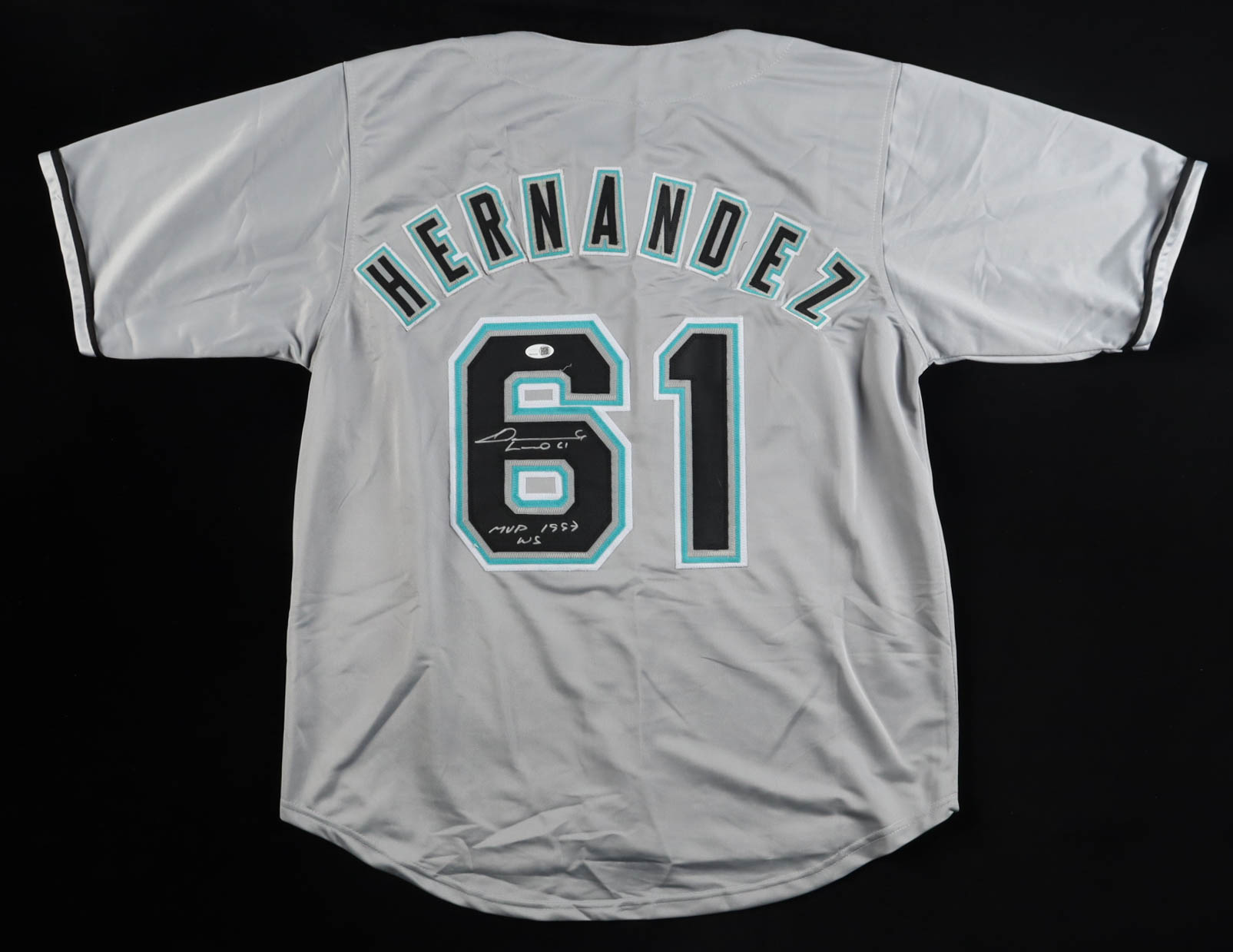 Custom jersey with everything sewn on, size XL. Hand-signed and inscribed by Livan Hernandez (Florida Marlins).