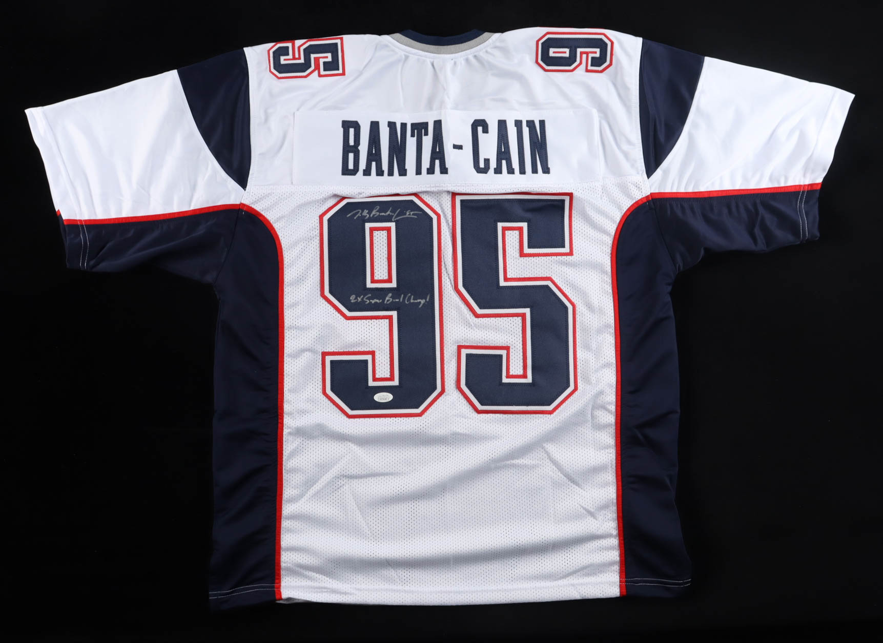 Custom jersey with everything sewn on, size XL. Hand-signed and inscribed by Tully Banta-Cain (New England Patriots).