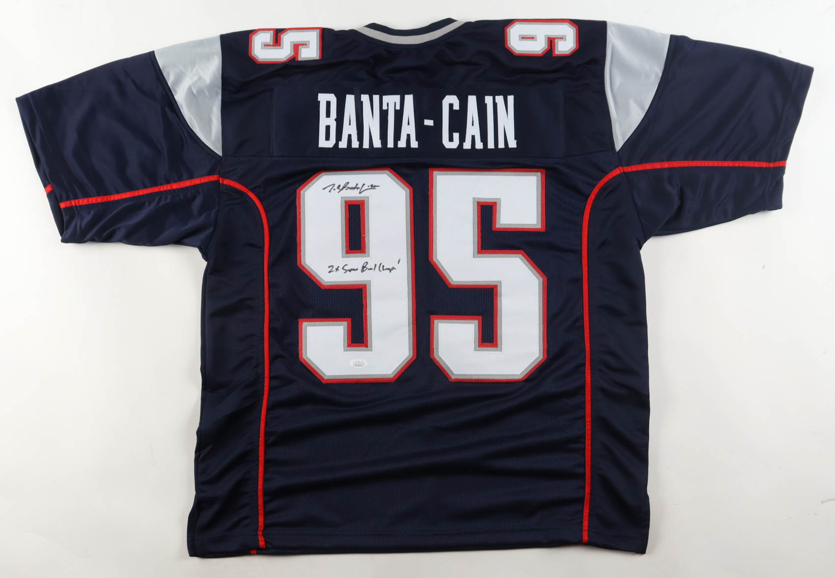 Custom jersey with everything sewn on, size XL. Hand-signed and inscribed by Tully Banta-Cain (New England Patriots).
