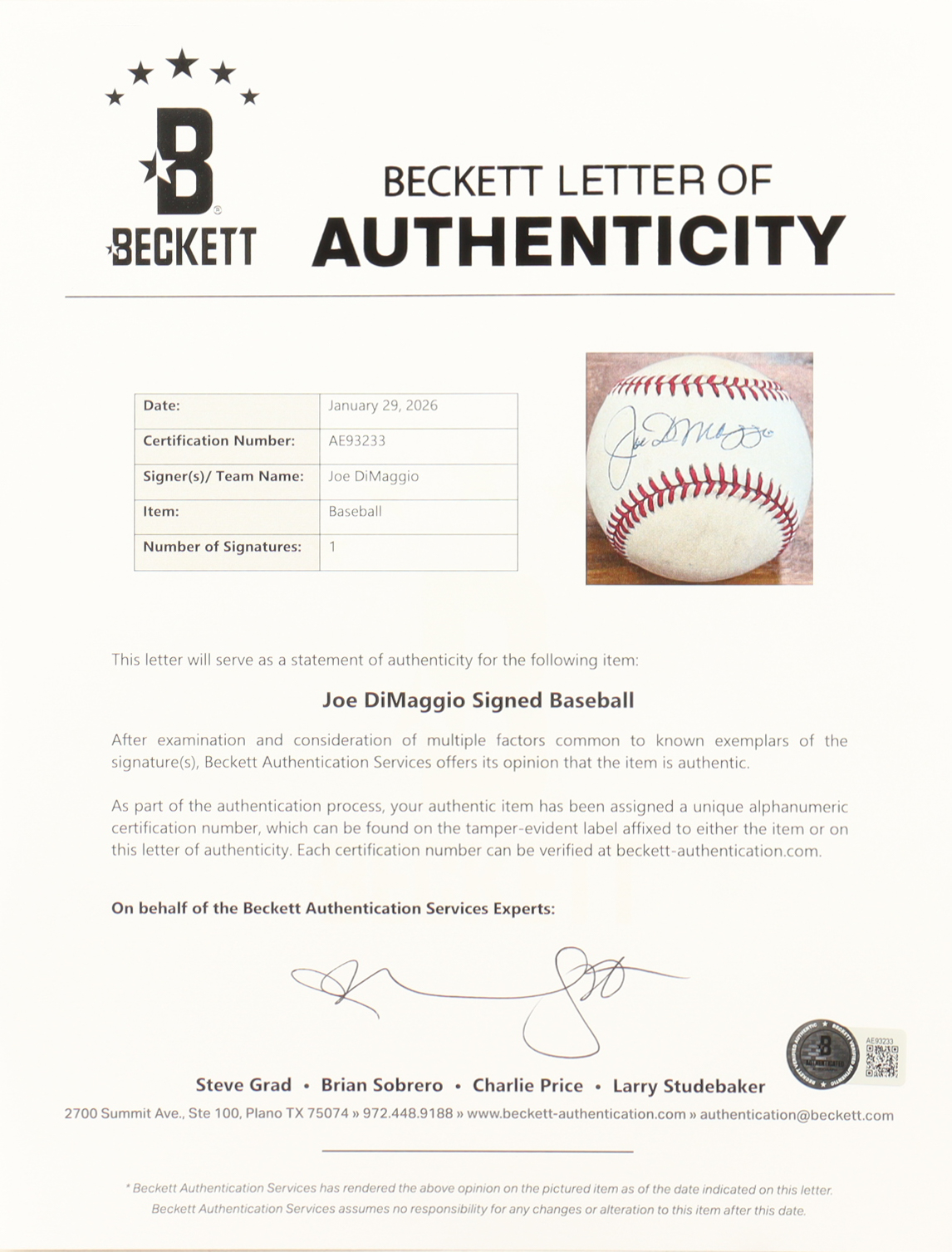 The autograph includes an official Beckett Authentication Services hologram and matching LOA for authenticity purposes.