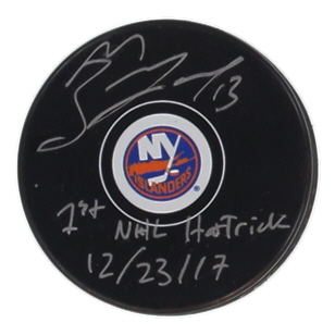 Mathew Barzal Signed Islanders Logo Hockey Puck Inscribed "1st NHL Hat Trick 12/23/17" (JSA)